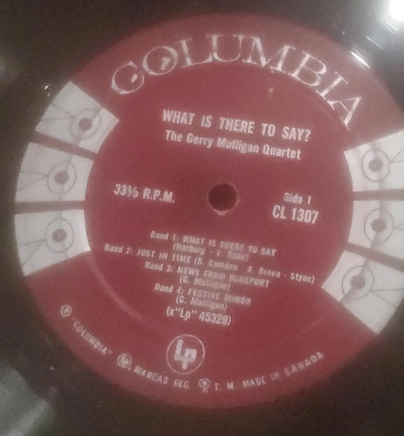 Selling a vinyl record by The Gerry Mulligan Quartet, titled "What Is There To Say?" It's a 33 ⅓ R.P.M. record, Side 1, CL 1307. The record includes the following tracks: