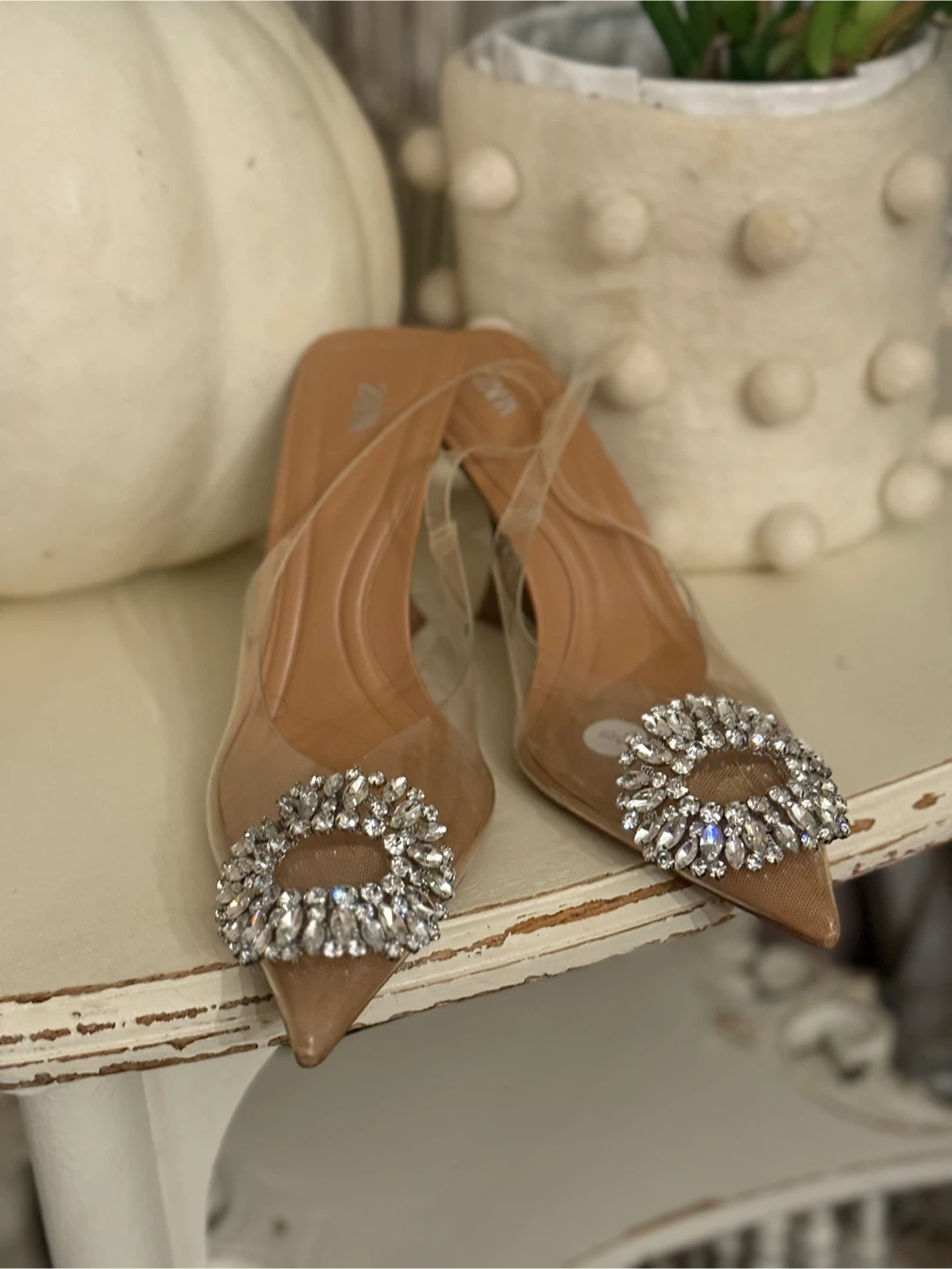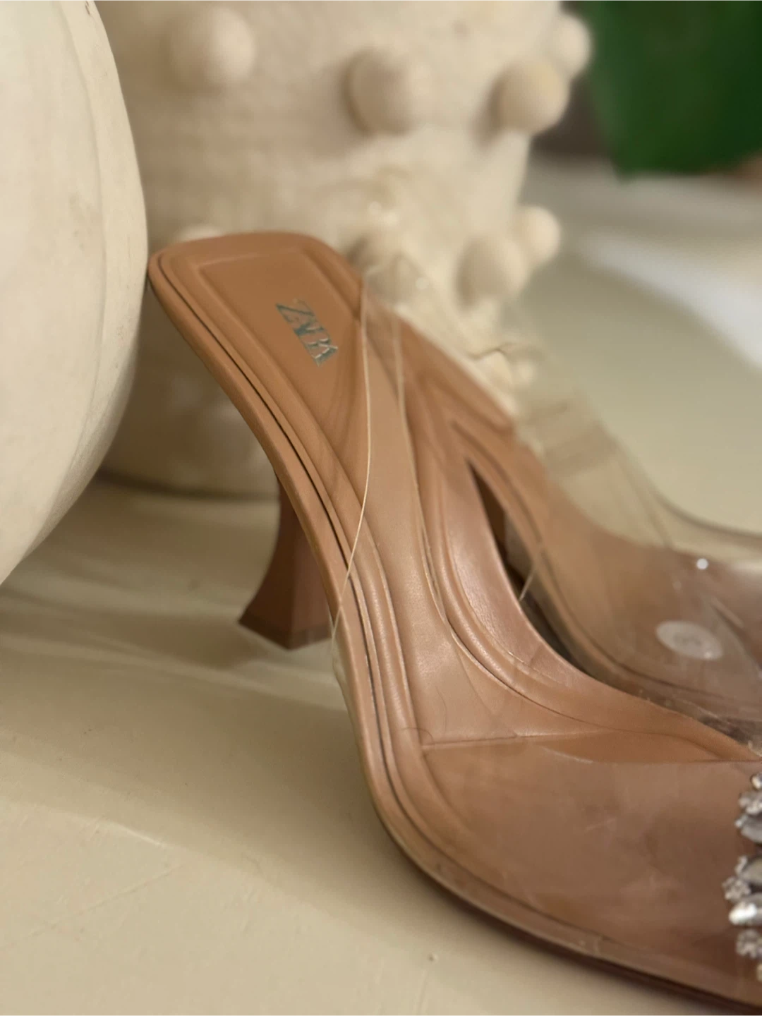 These Zara heels feature a clear design with a cute rhinestone buckle detail. They're perfect for adding a touch of sparkle to any outfit!