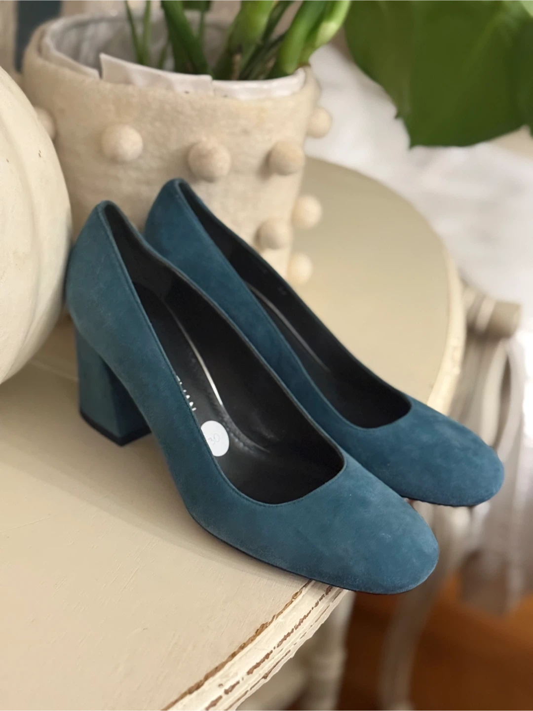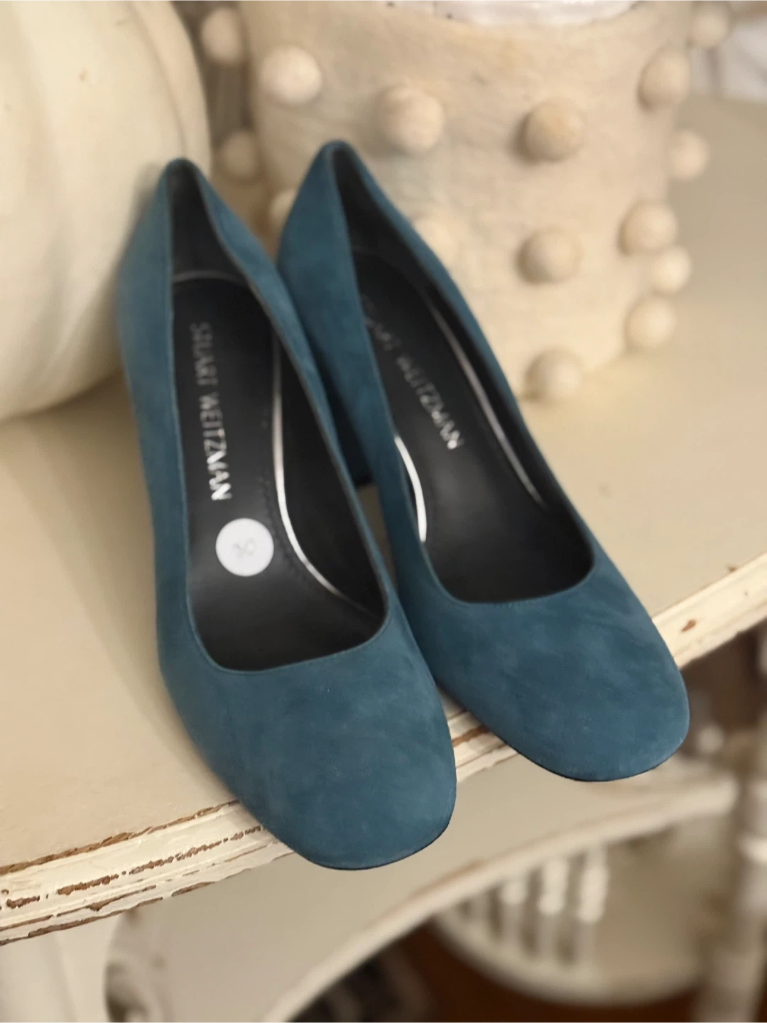 Selling a pair of Stuart Weitzman heels in a beautiful teal suede! They're a size 7and would be a lovely addition to your wardrobe. These heels are perfect for dressing up any outfit!