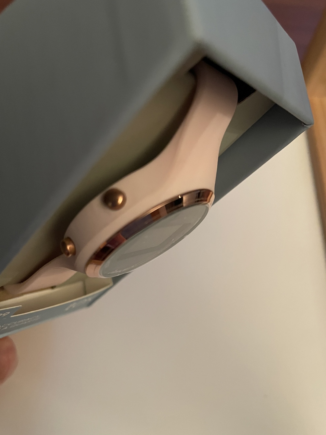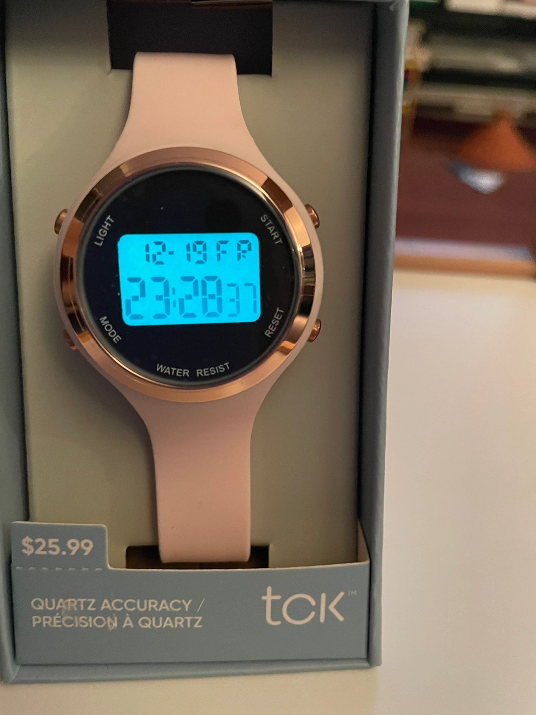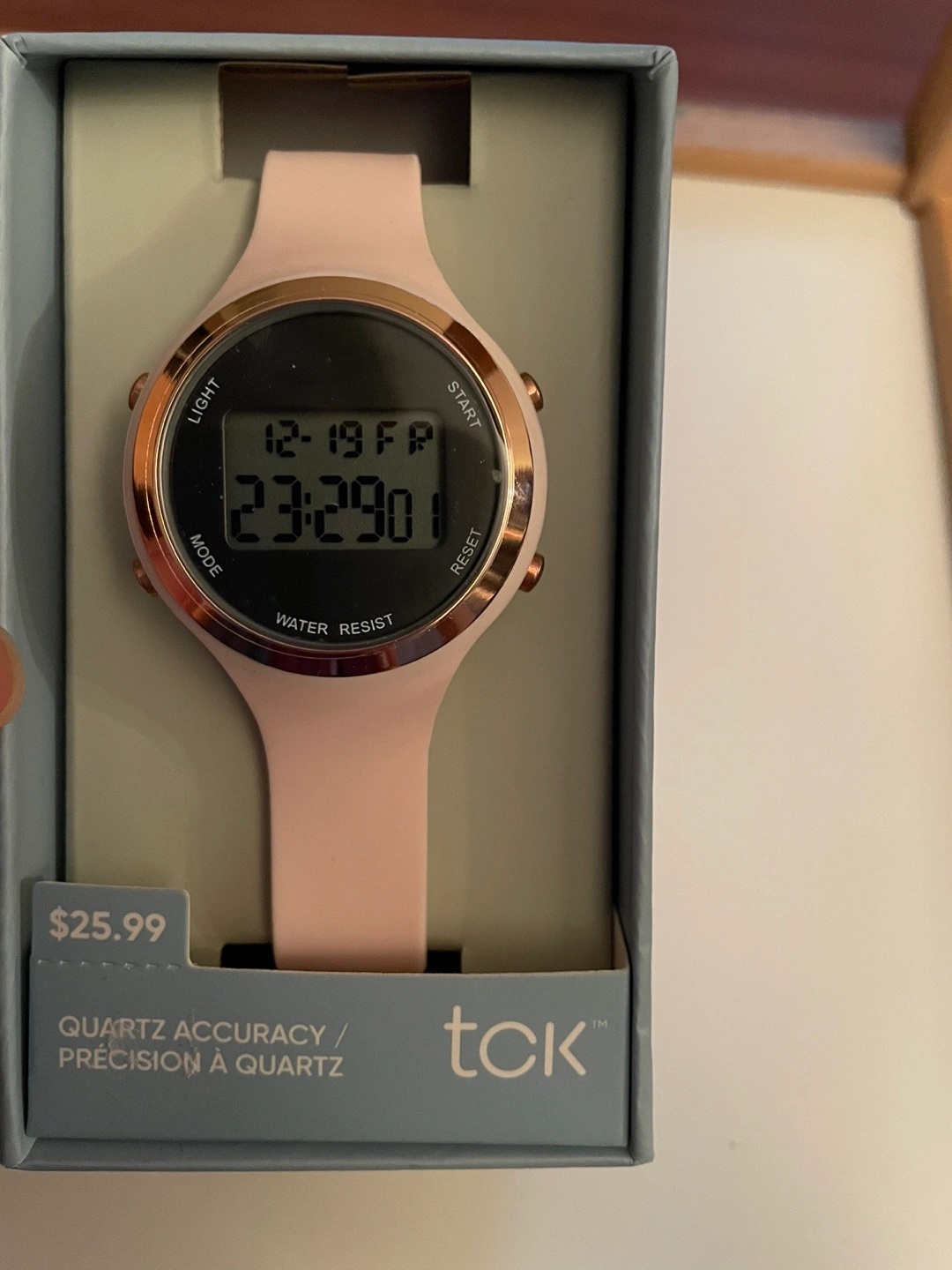 Brand new watch with light pink silicone band and rose gold detail. Has start stop buttons and a light up button. Water resistant.