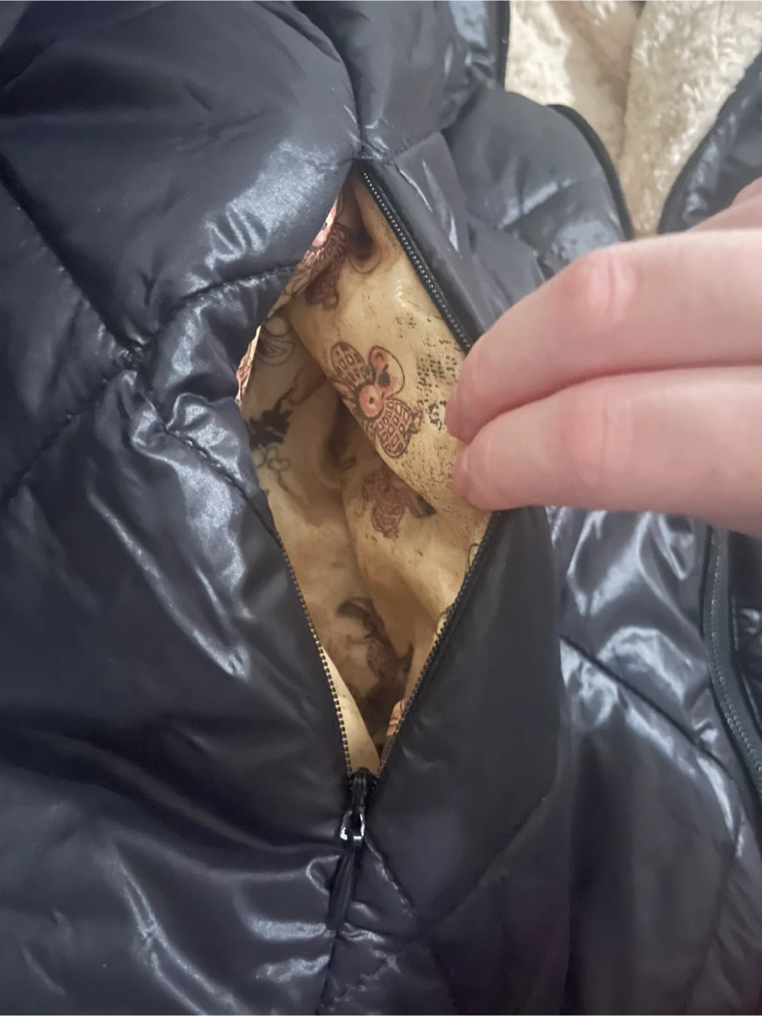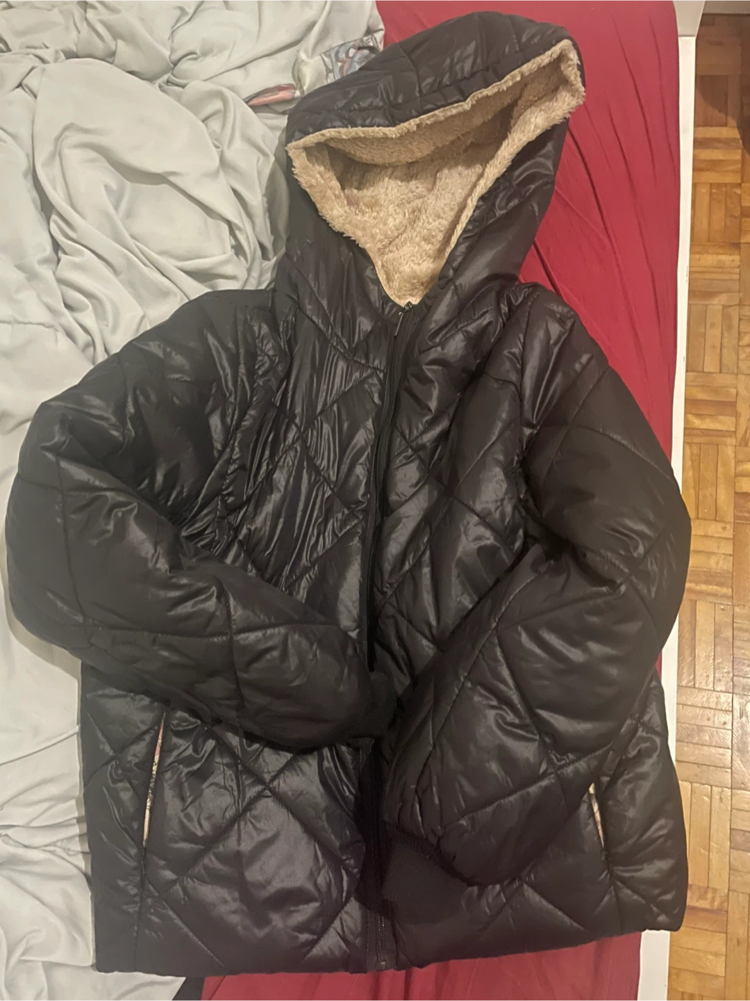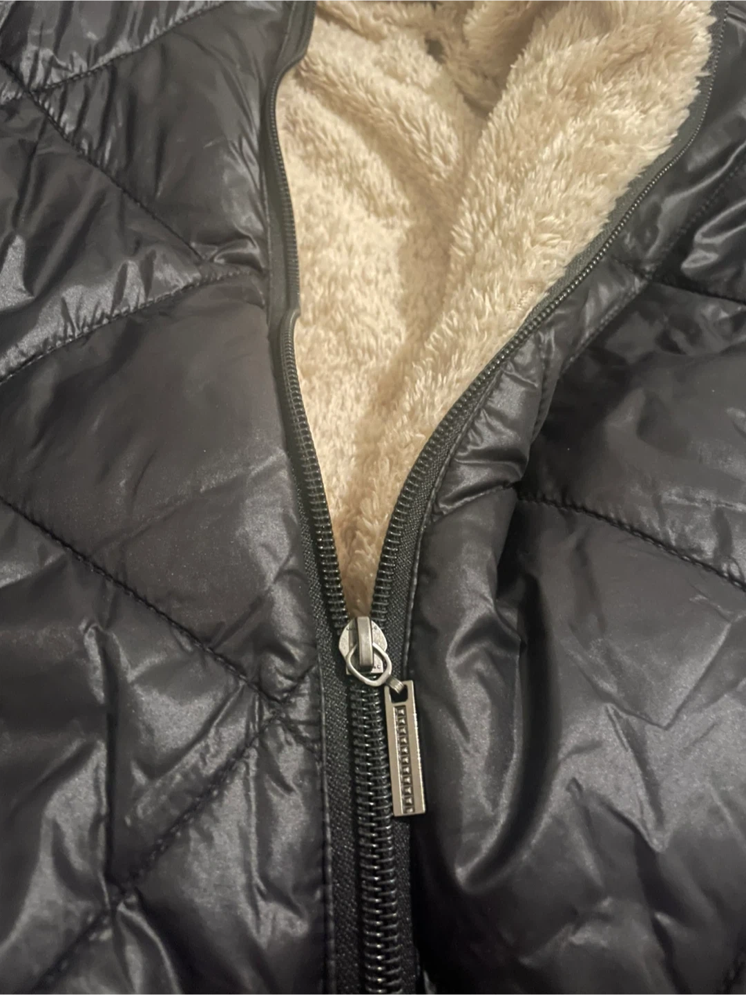 Here's a cozy black puffer jacket with a hood. It features a quilted design and a soft, plush lining also has zipper pockets.