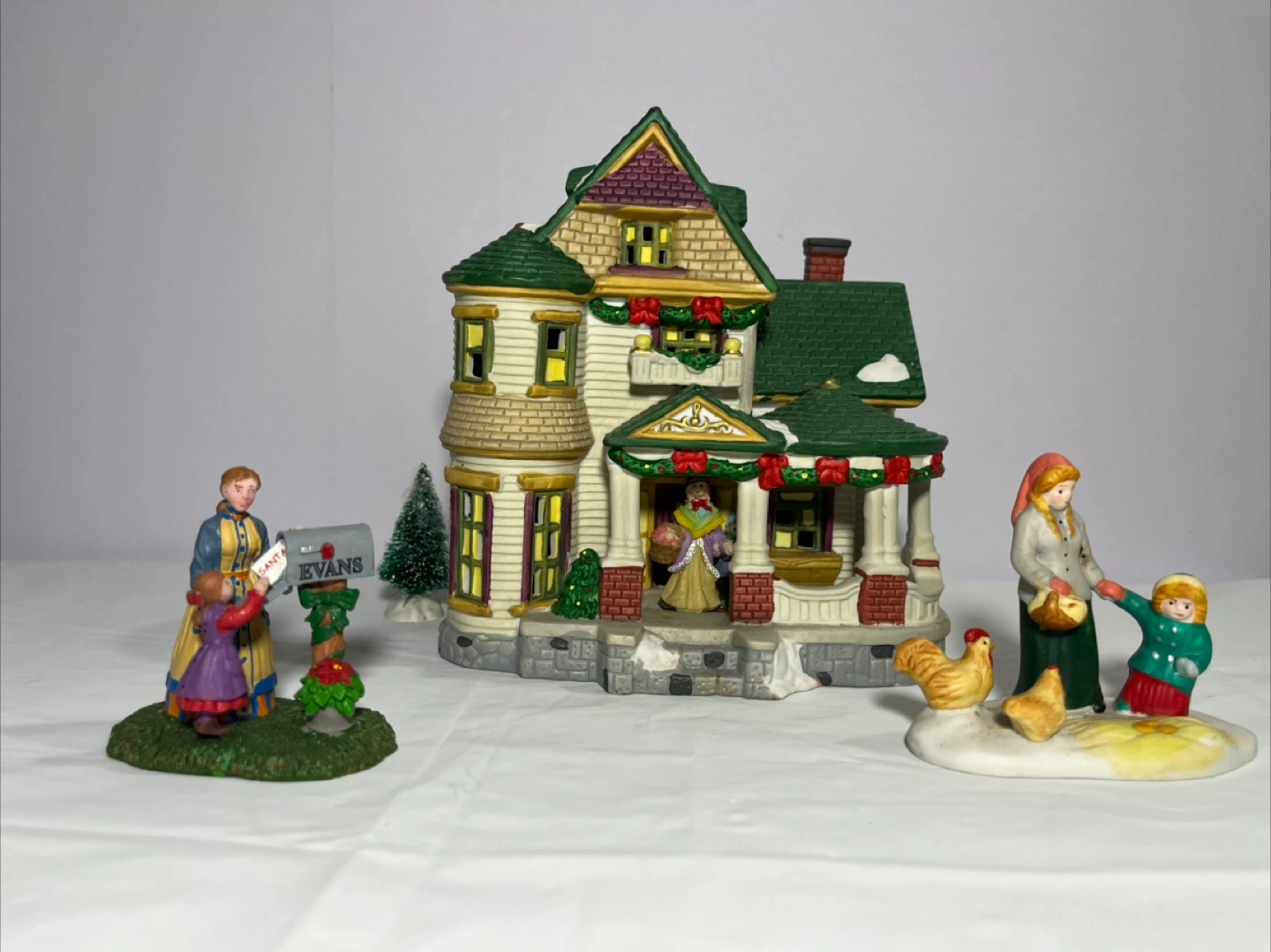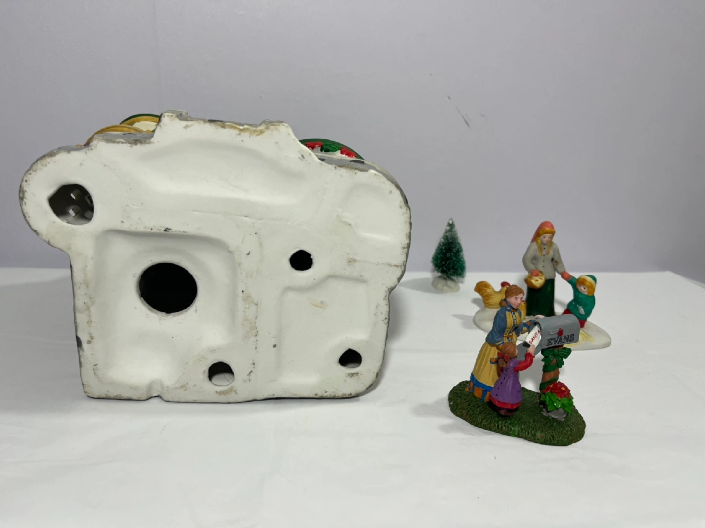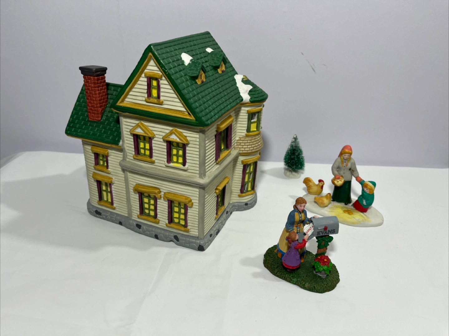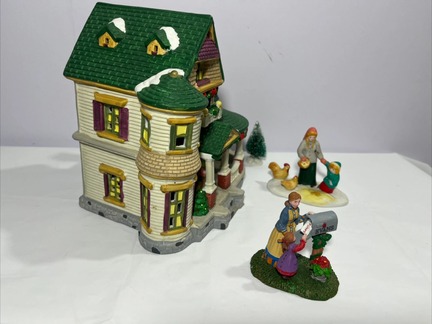 This is a charming Christmas village house figurine. It features a detailed house with a green roof and a family figurine with a mailbox. Perfect for adding a touch of holiday cheer to your home