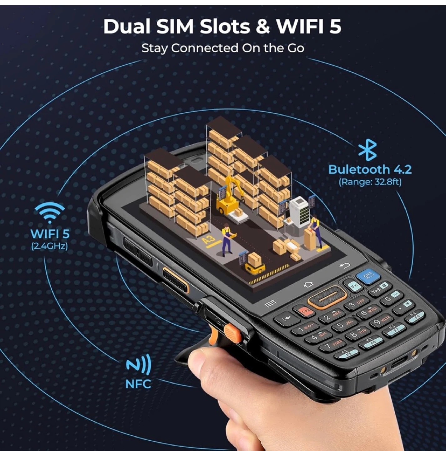 [Dual SIM Slots & WiFi 5] The MUNBYN PDA scanner features dual SIM card slots, allowing for dual standby capability and enhanced connectivity options. Additionally, it supports WiFi 5, ensuring faster and more stable wireless connections. This Android PDA ensures a continuous network connection whether used in indoor warehouses or outdoor logistics environments.