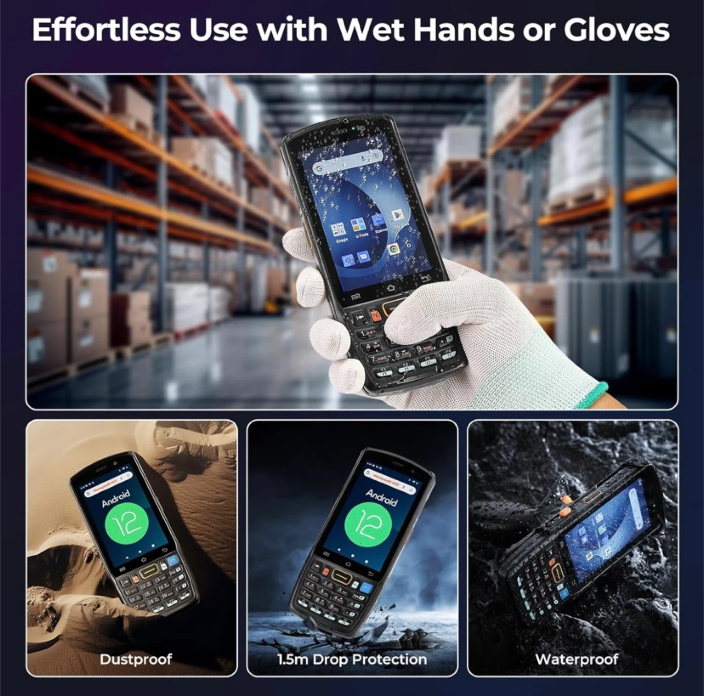 [IP67 Protection Rating] Designed with an IP67 protection rating, the MUNBYN barcode scanner with keypad offers robust protection and ensures 4.9-foot drop resistance. The IP67 rating provides superior water immersion resistance compared to IP65 PDAs. This inventory scanner can withstand temporary water immersion at depths ranging from 150mm to 1000mm (6 inches to 39 inches) for up to 30 minutes, making it ideal for use in harsh warehouse or outdoor environments