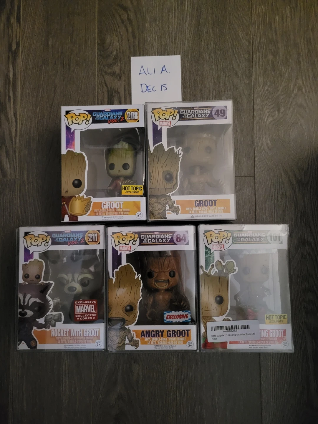Selling a collection of Guardians of the Galaxy Funko Pops! Includes Groot #208 (Hot Topic Exclusive), Groot #49, Rocket with Groot #211 (Marvel Collector Corps Exclusive), Angry Groot #84 (Exclusive), and Dancing Groot #101 (Hot Topic Exclusive). All figures are in their original boxes and in great condition!