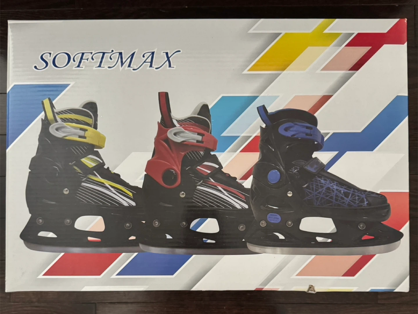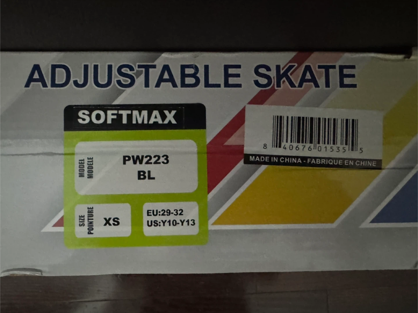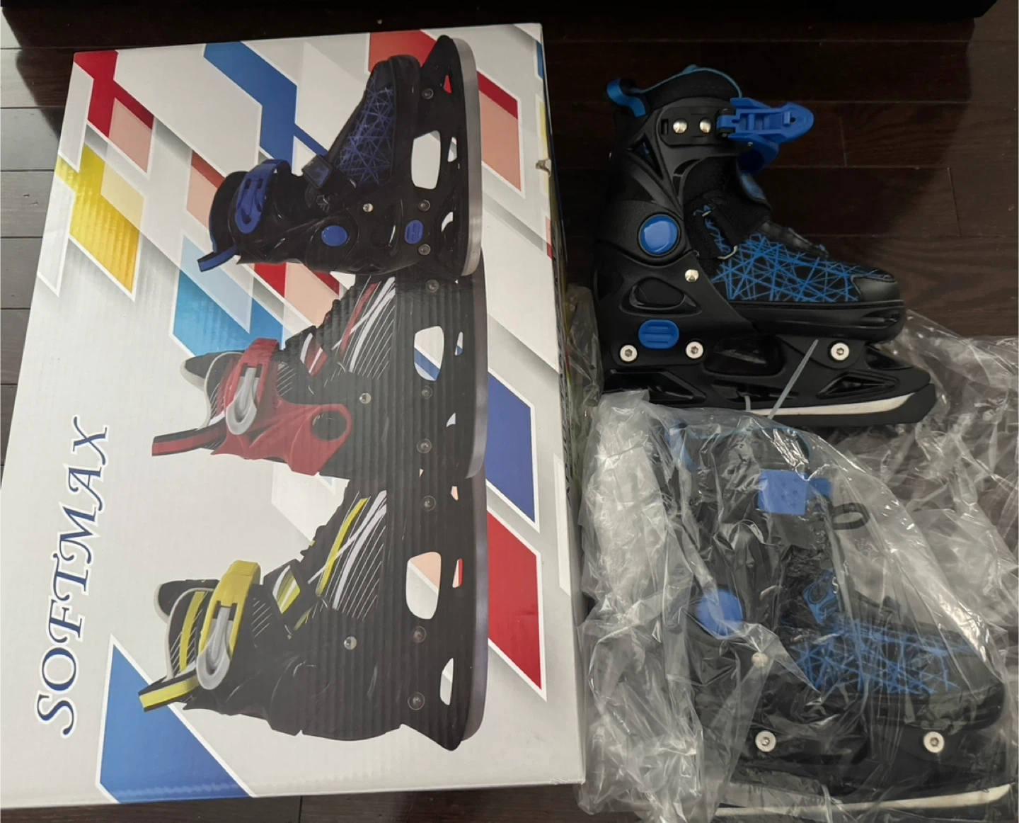 Selling a pair of Softmax adjustable skates in size XS (US Y10-Y13, EU 29-32). The model is PW223 BL. They are black with blue accents and come with the original box