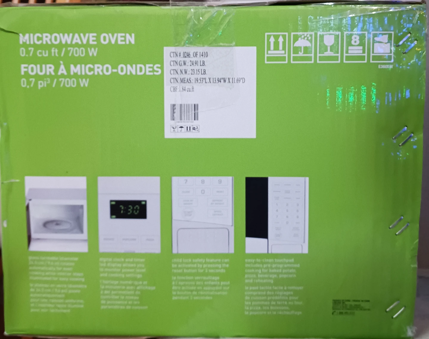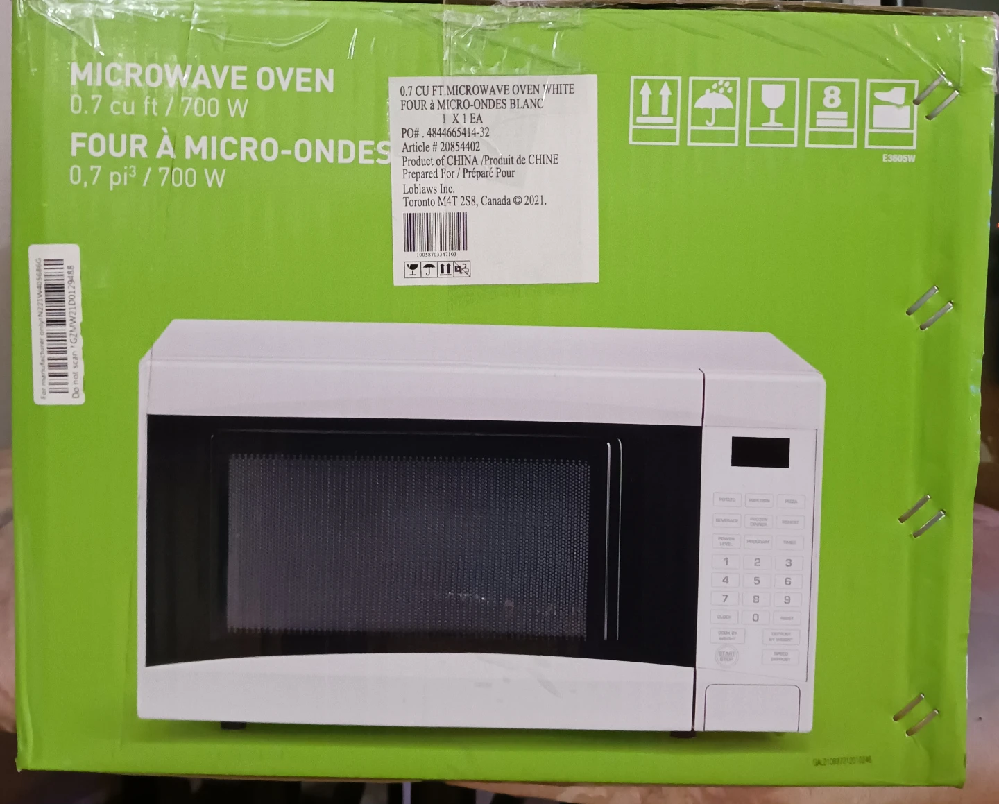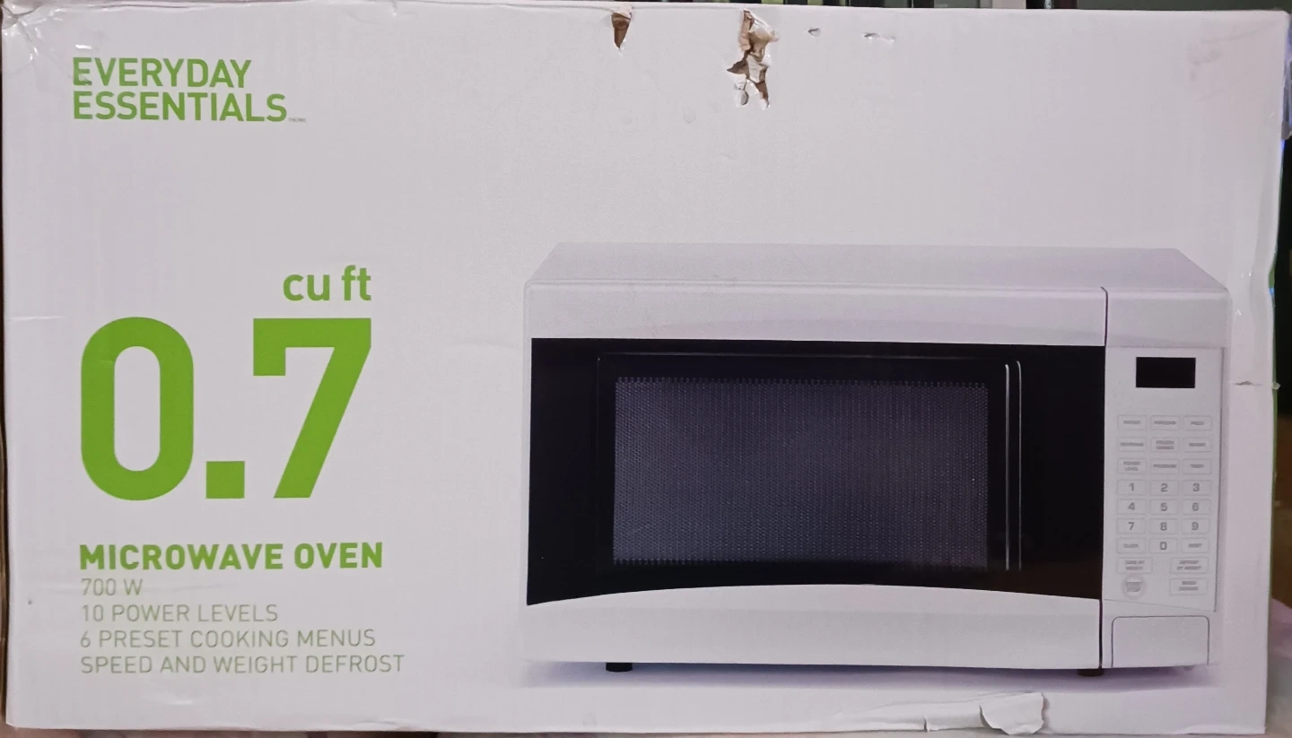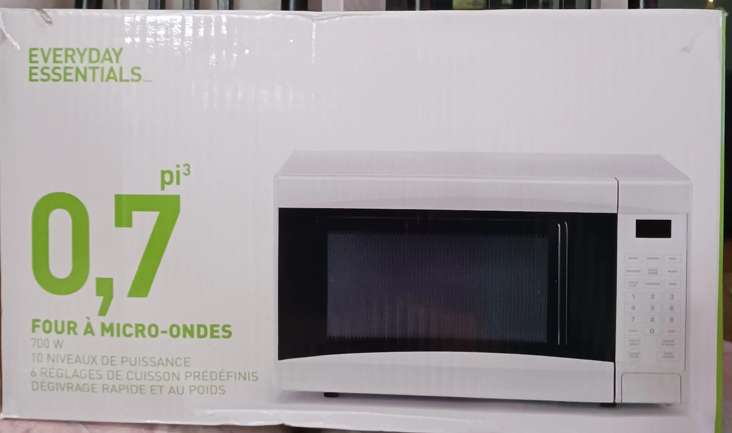 Selling a new, never used, an Everyday Essentials 0.7 cu ft microwave oven in white. It has 700 W power, 10 power levels, and 6 preset cooking menus. It also features speed and weight defrost. The box is included!