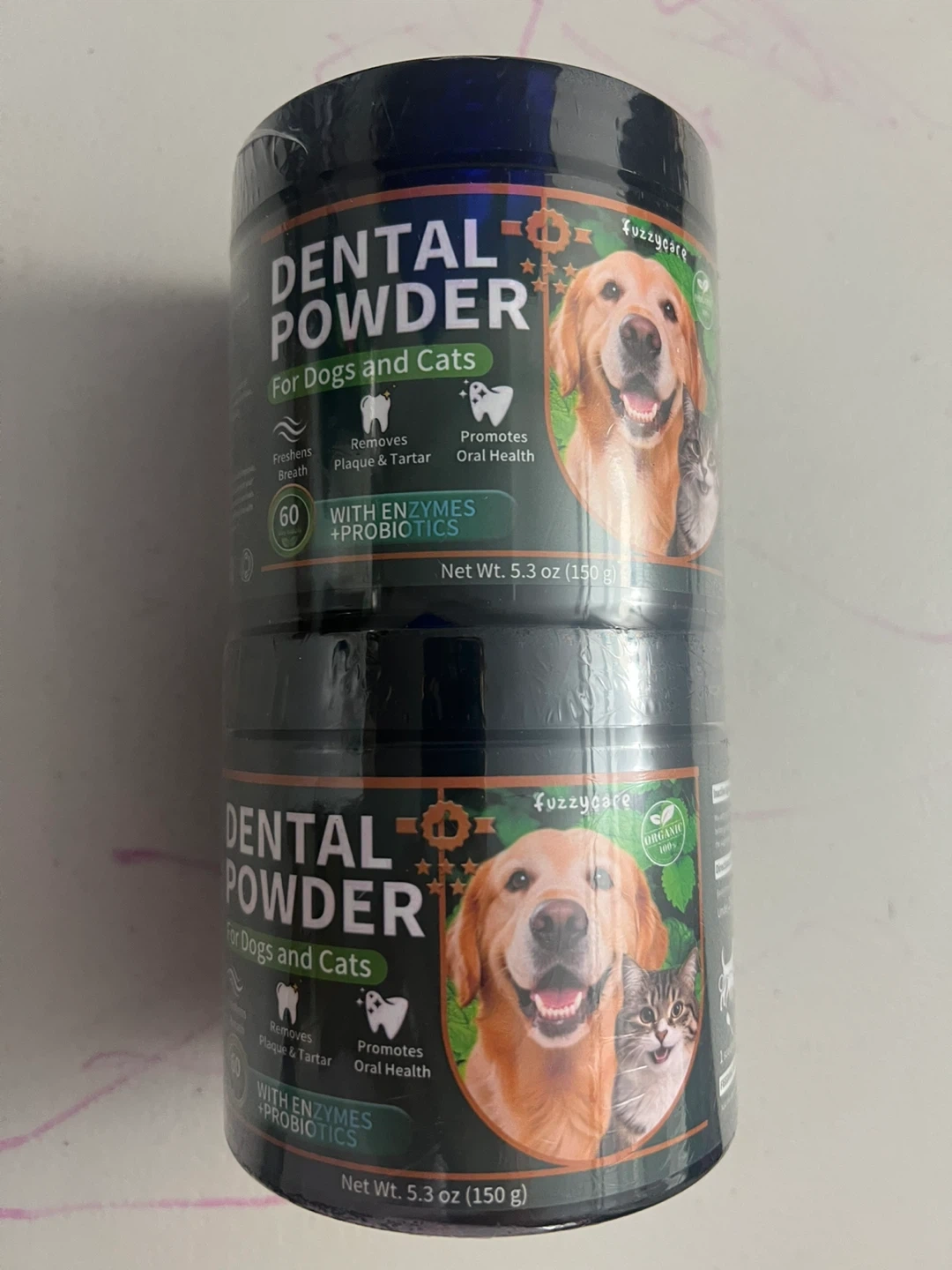 I'm selling Fuzzycare Dental Powder for dogs and cats! It freshens breath, removes plaque and tartar, and promotes oral health. It contains enzymes and probiotics. Net weight is 5.3 oz (150 g).