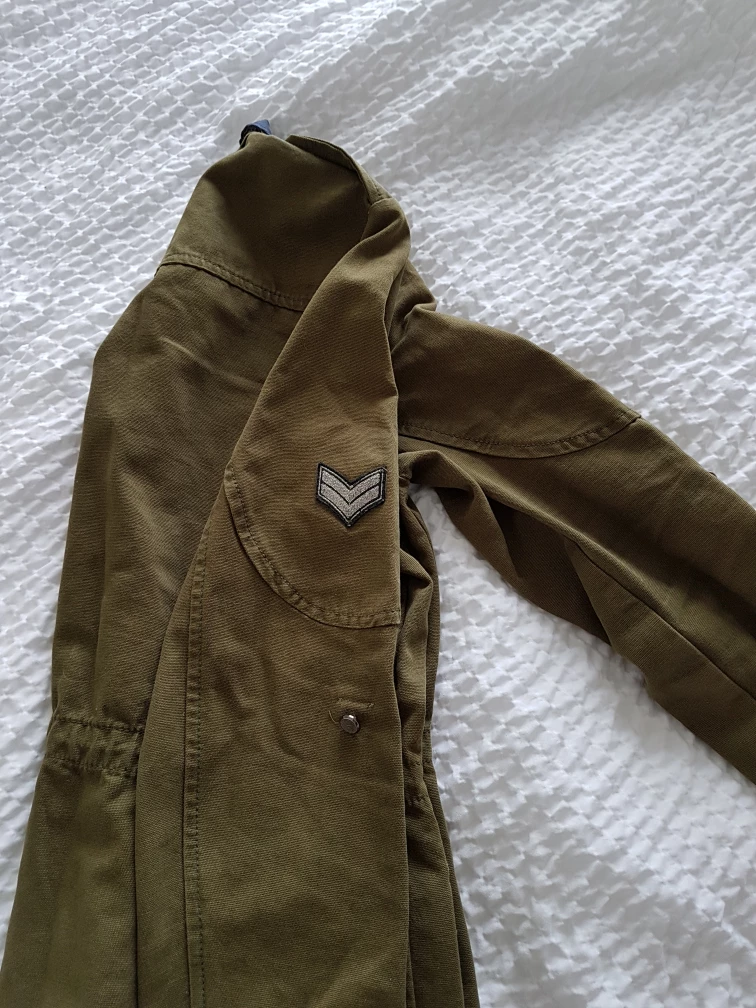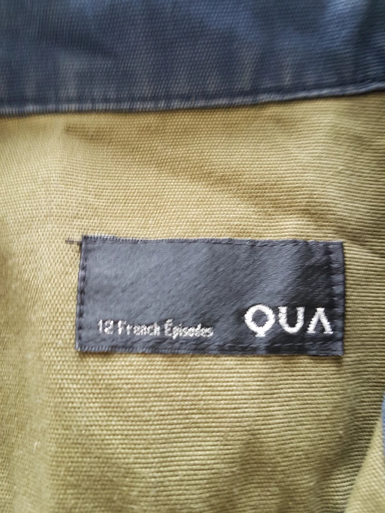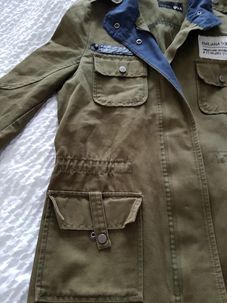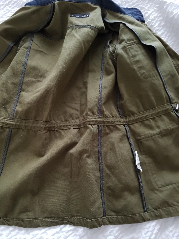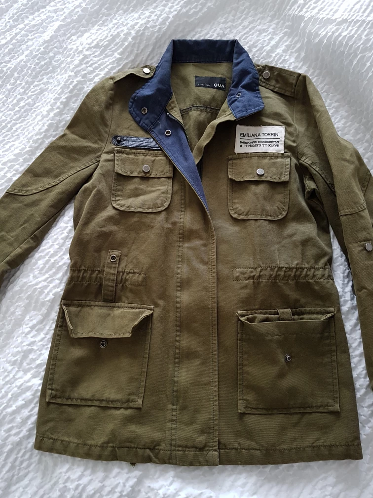 Here's a gently used olive green jacket from QUA. It features a military-inspired design with multiple pockets and a blue collar detail. Perfect for adding a touch of utilitarian style to your wardrobe!