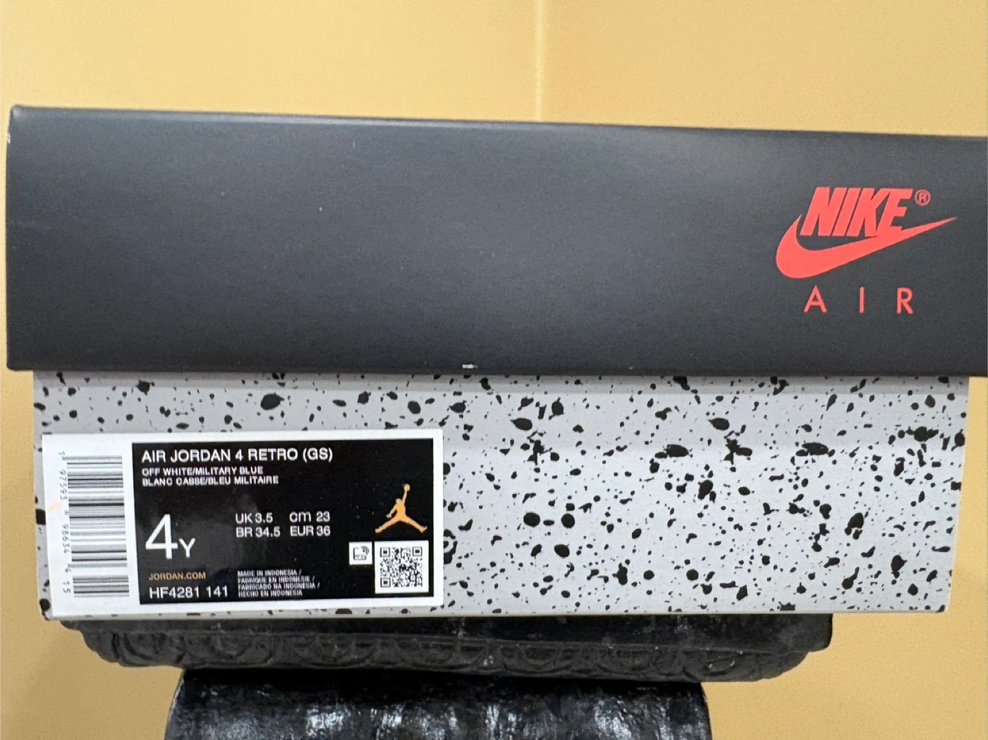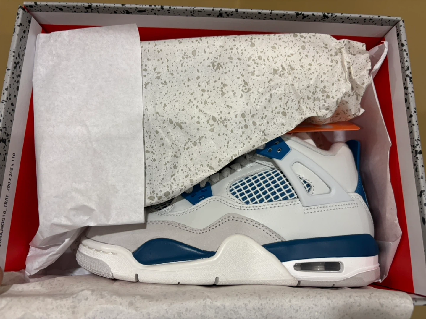 Selling a brand new pair of Air Jordan 4 Retro (GS) in size 4Y. They are white, off-white, and military blue. Comes with the original box!
