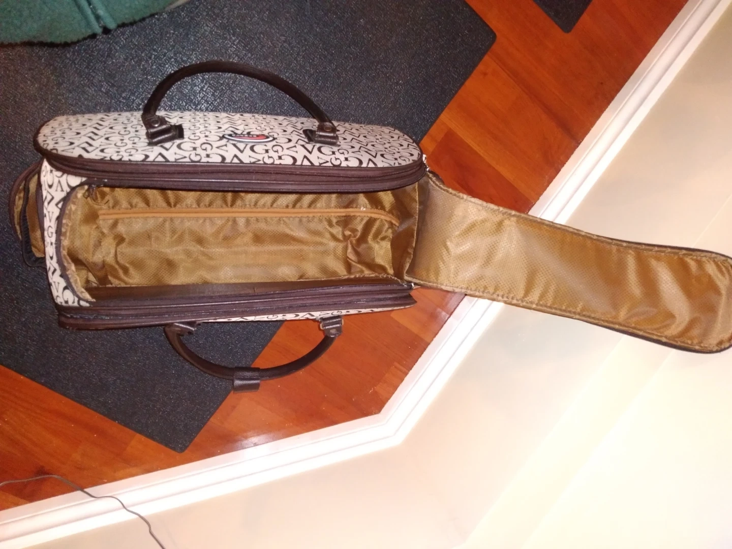 Selling a travel bag with two wheels. It has a black and beige pattern with brown handles. It has a zippered closure and an extendable handle for easy rolling. Great for travel!