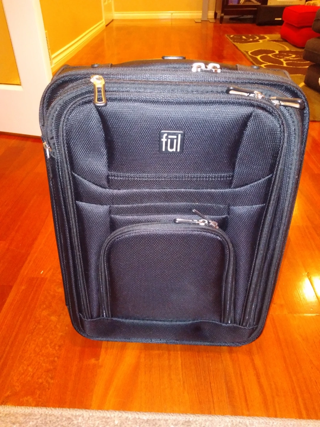 I'm selling a Ful rolling carry-on luggage in black. It's in great shape and ready for your next trip! It's the perfect size for carry-on and easy to manoeuvre through the airport