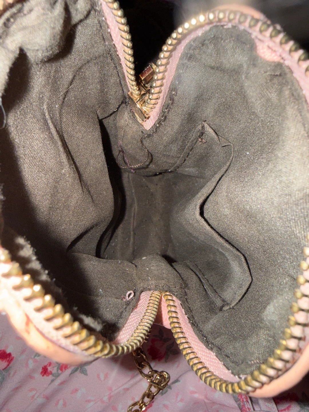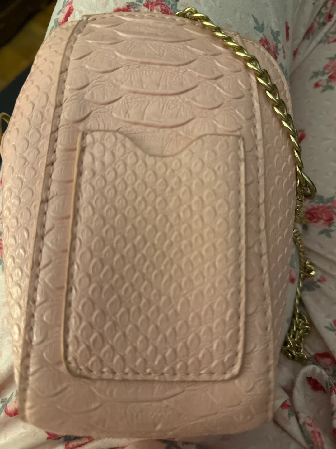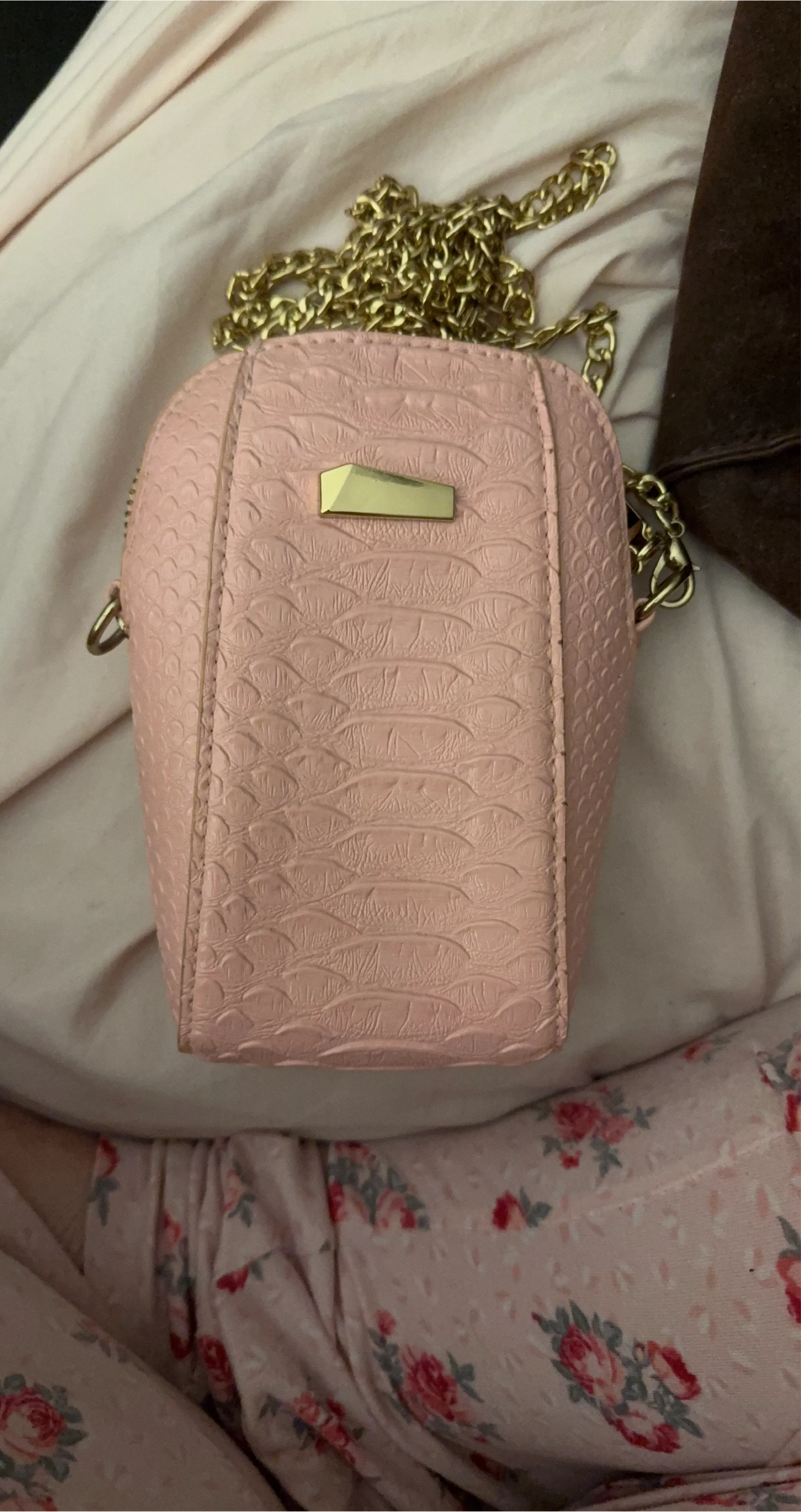 This is a cute pink crossbody bag with a gold chain strap. It has a textured exterior and a zippered closure. Perfect for carrying small essentials!