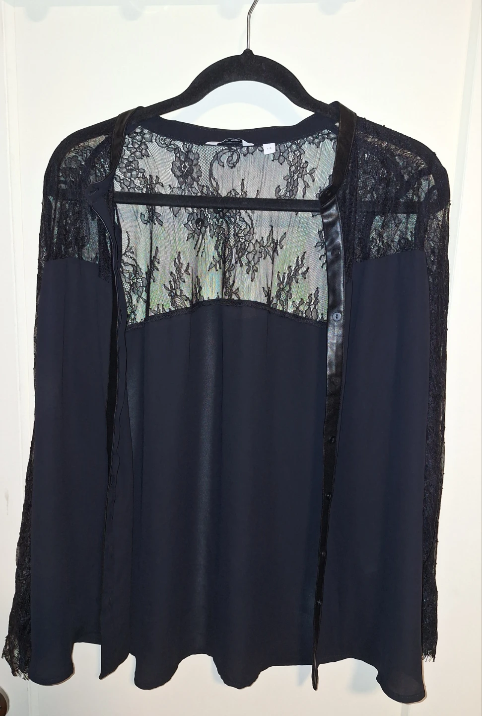 Selling a beautiful black lace blouse from Reitmans! It's a size L and in great condition. The lace detailing adds a touch of elegance, perfect for dressing up or down. Feel free to reach out if you have any questions!!