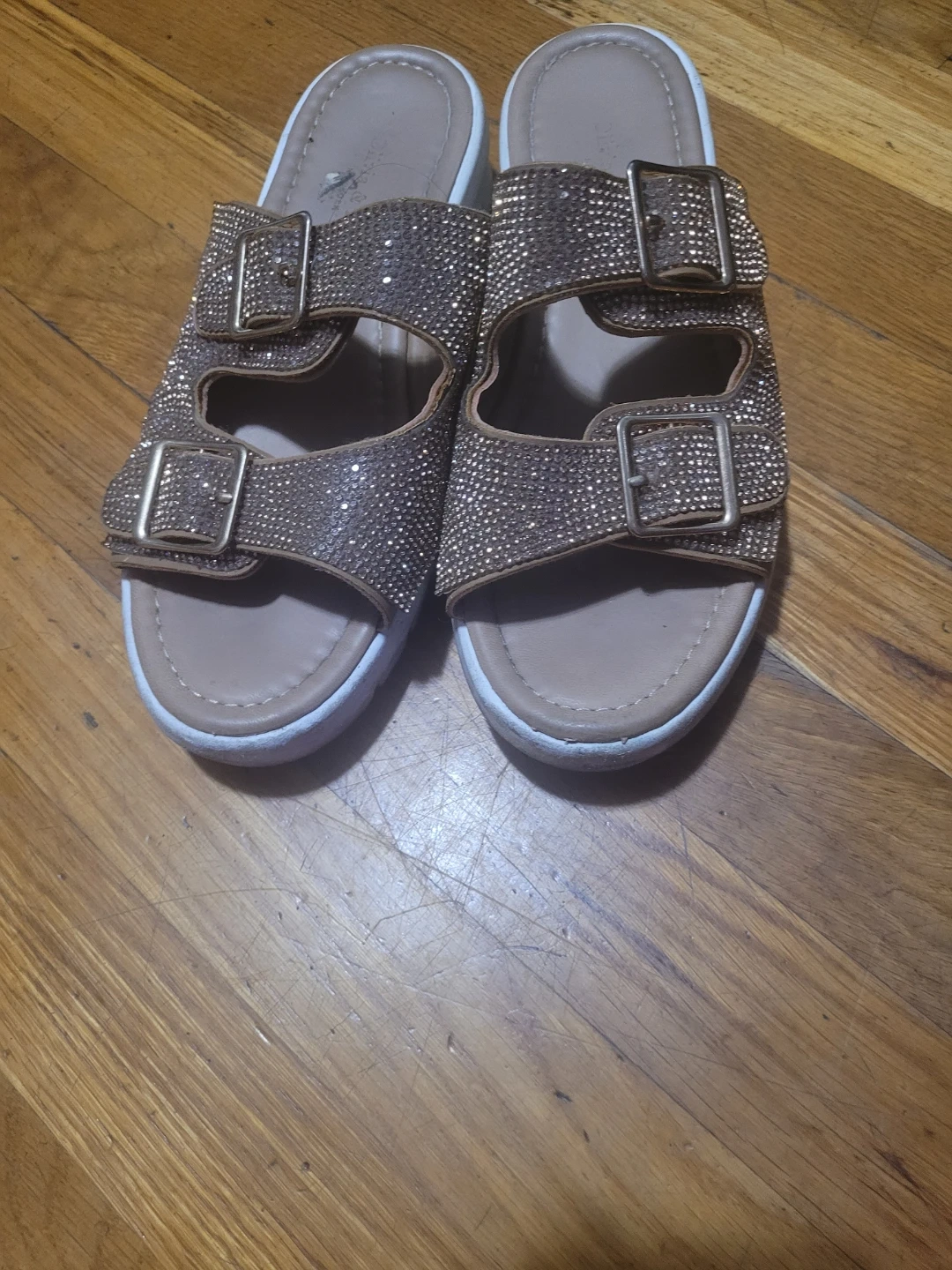 These sandals feature a platform sole and are embellished with rhinestones. They have a double buckle strap design. Perfect for adding a touch of sparkle to your outfit!