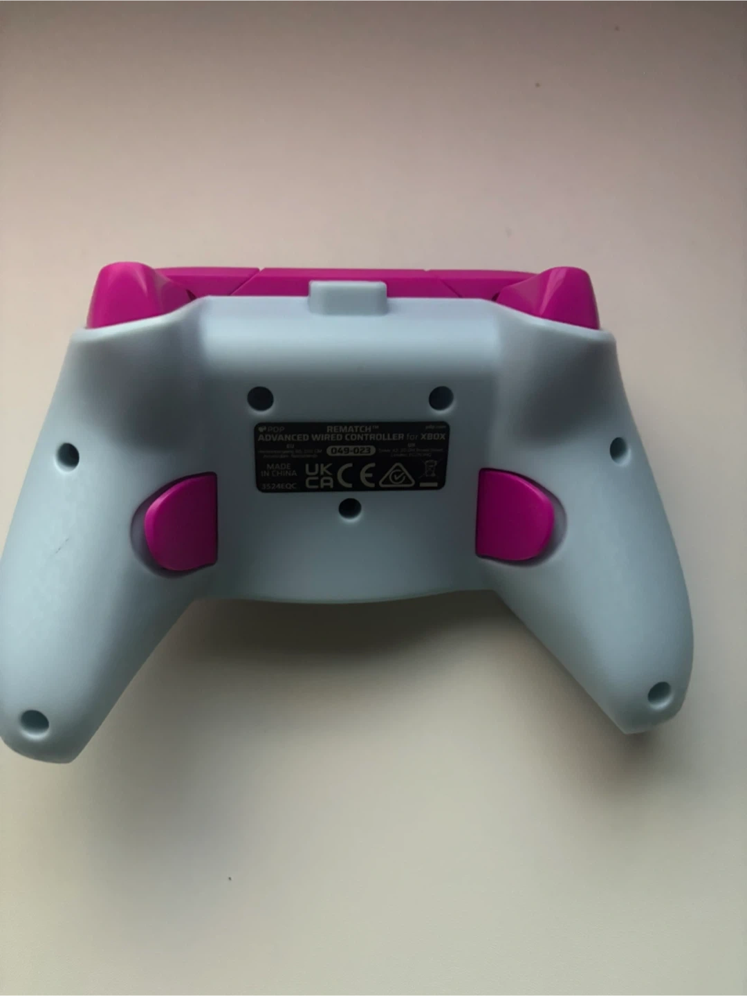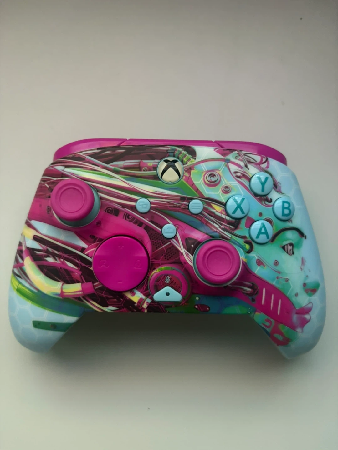 Selling a Rematch Advanced Wired Controller for Xbox. It's in great condition and ready for a new gamer! The controller has a unique and vibrant design with pink and light blue accents.