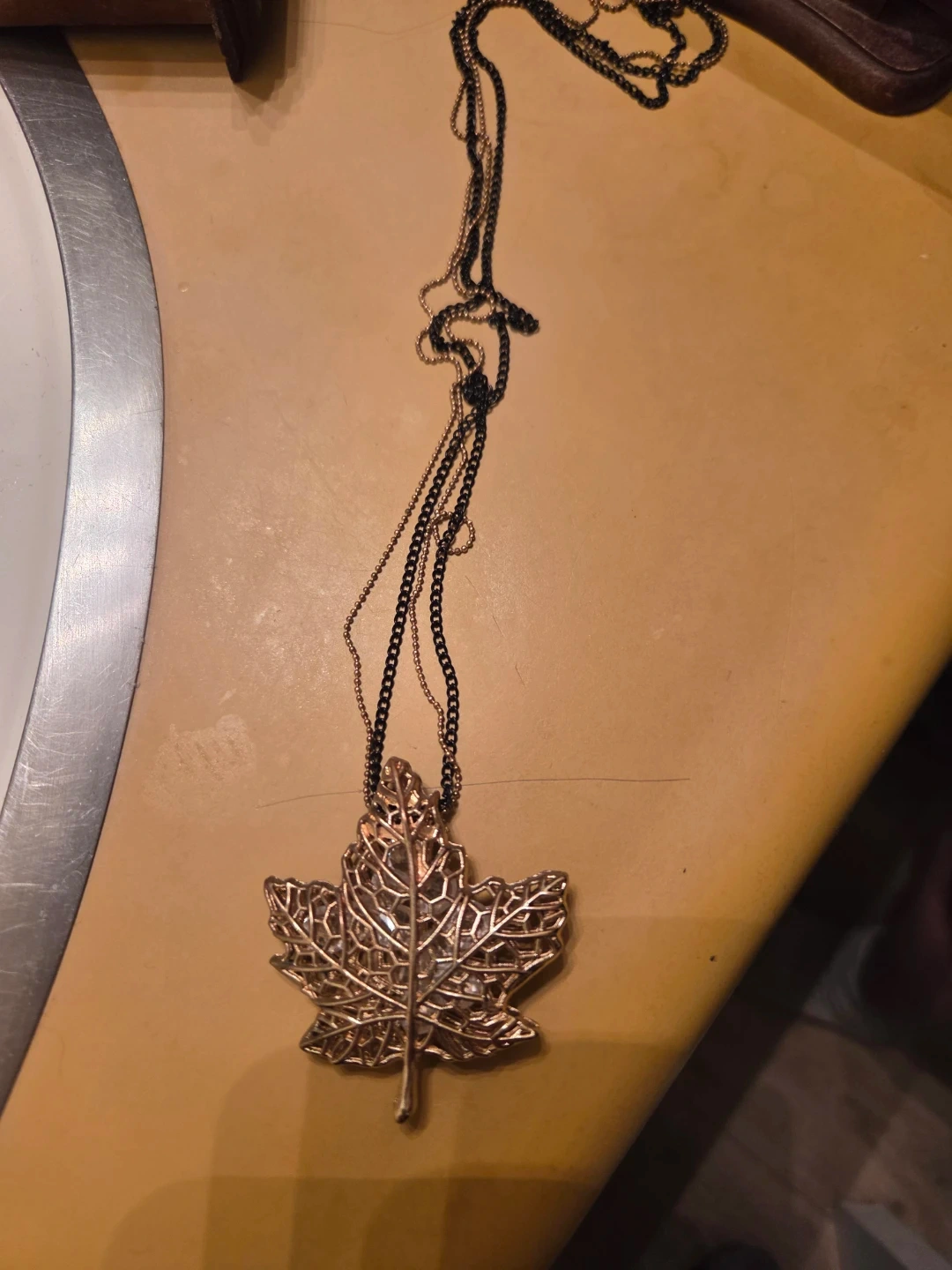Here's a cute maple leaf pendant necklace! It features a gold-tone maple leaf pendant on a multi-strand chain with both gold and black tones. Perfect for adding a touch of Canadian flair to any outfit