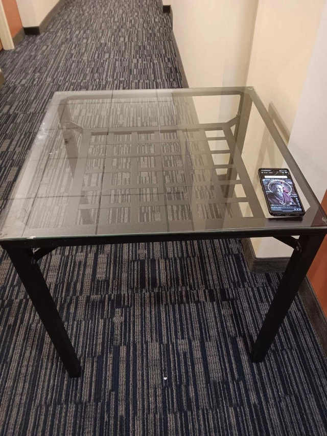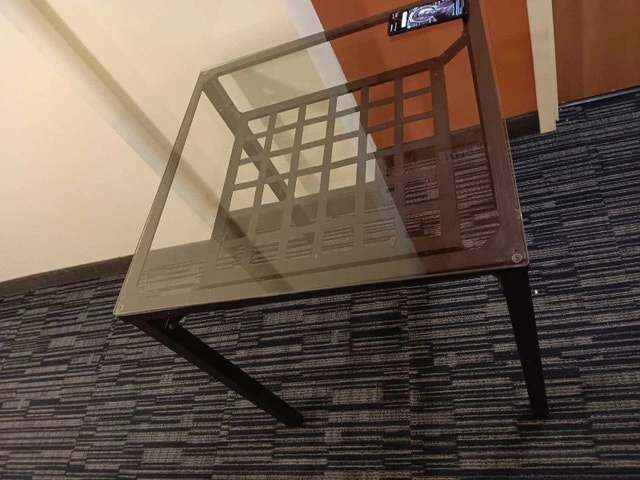 Tempered glass-top table with a black metal frame. Asking $90 or best offer. Price recently reduced as of October 5, 2025. The table has been disassembled to free up space. To reassemble it, you'll need an Allen key, but it's straightforward and takes about 15 minutes. All nuts and bolts are included. It's in very good condition with an open grid shelf beneath the glass. There may be a few light scratches on the glass, but they are hardly noticeable. Text or call 343-999-5770 for measurements. Decorations in photos are not for sale.