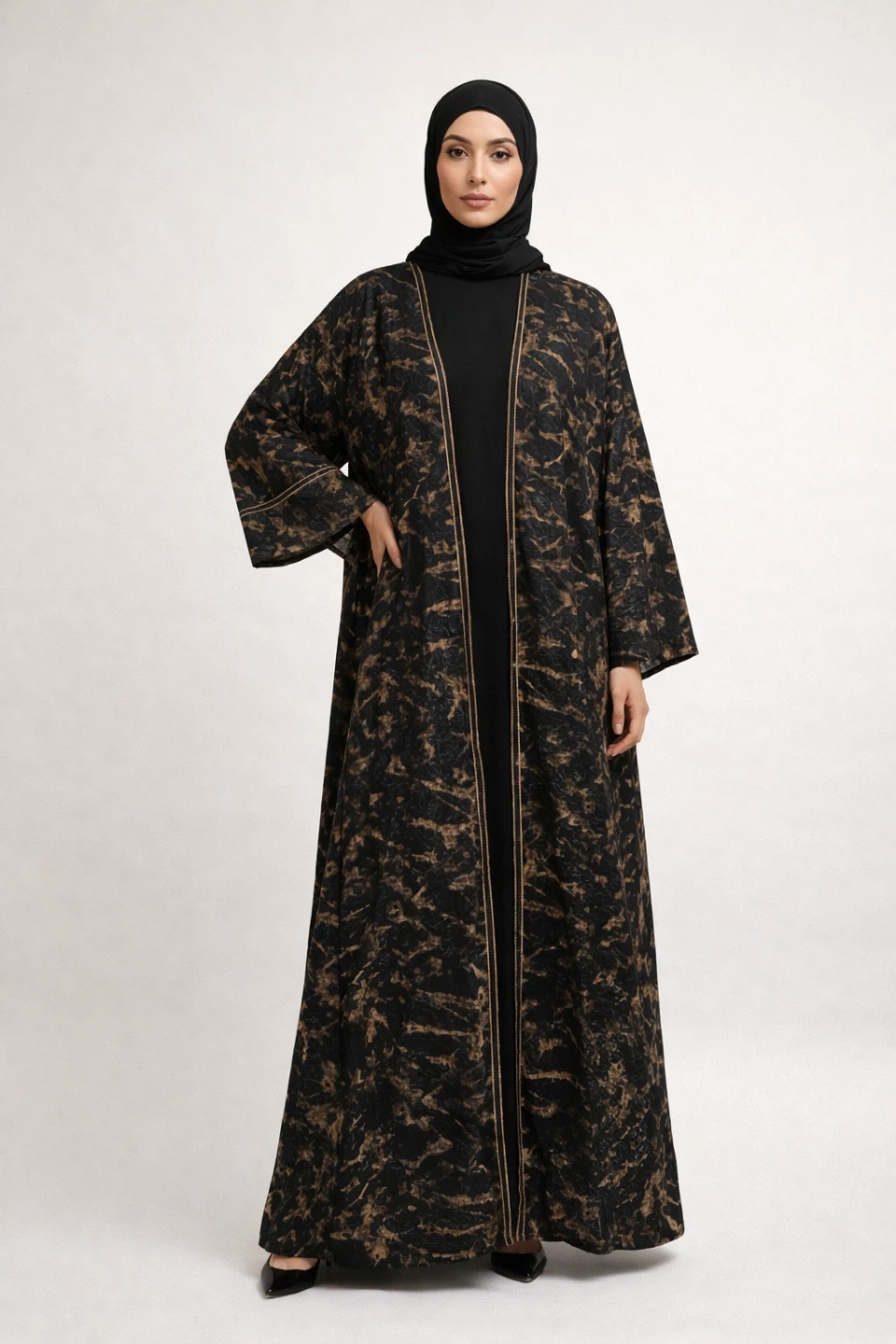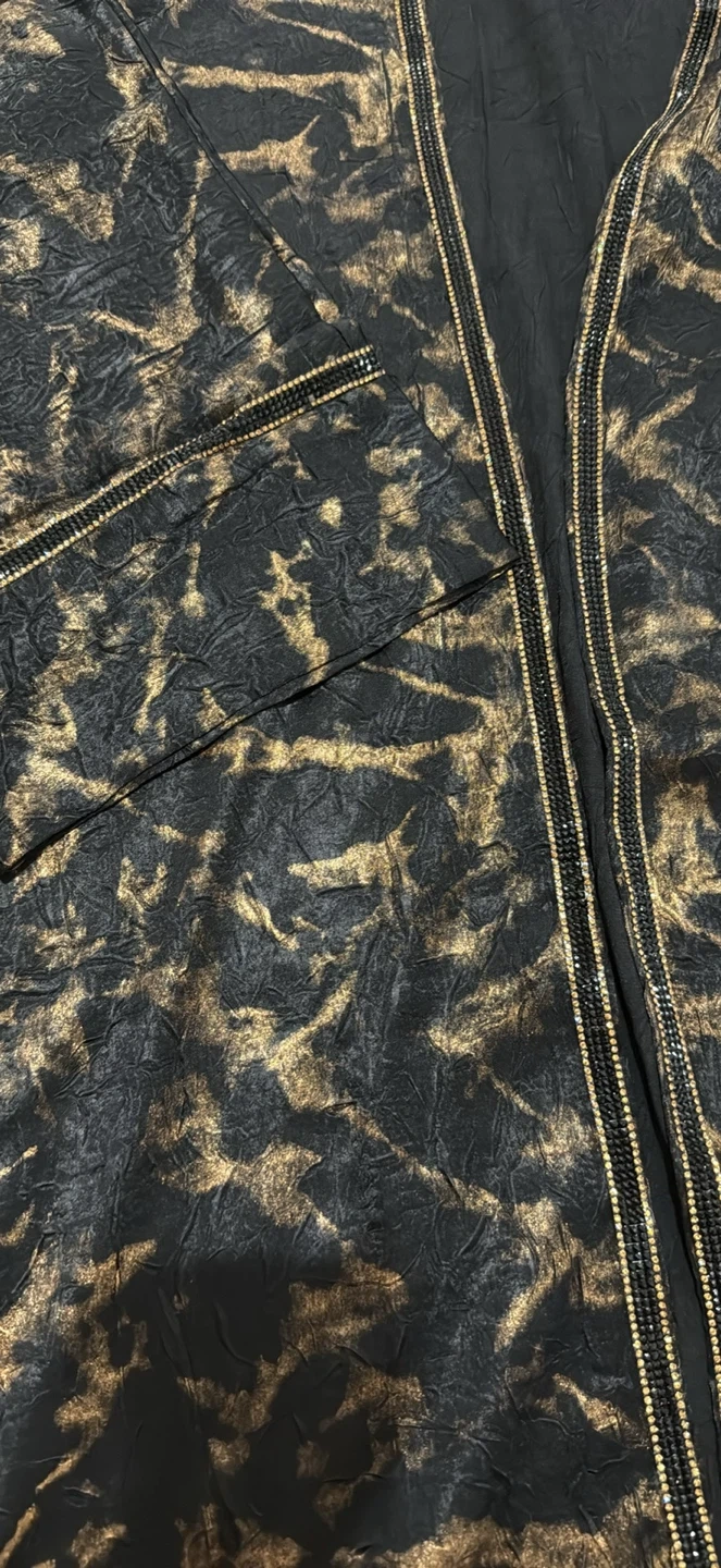 Check out this beautiful abaya! It features a stylish black and gold design, perfect for any occasion. It's in great condition and is a size medium. The material feels lovely and has a unique texture. Don't miss out on adding this to your wardrobe!