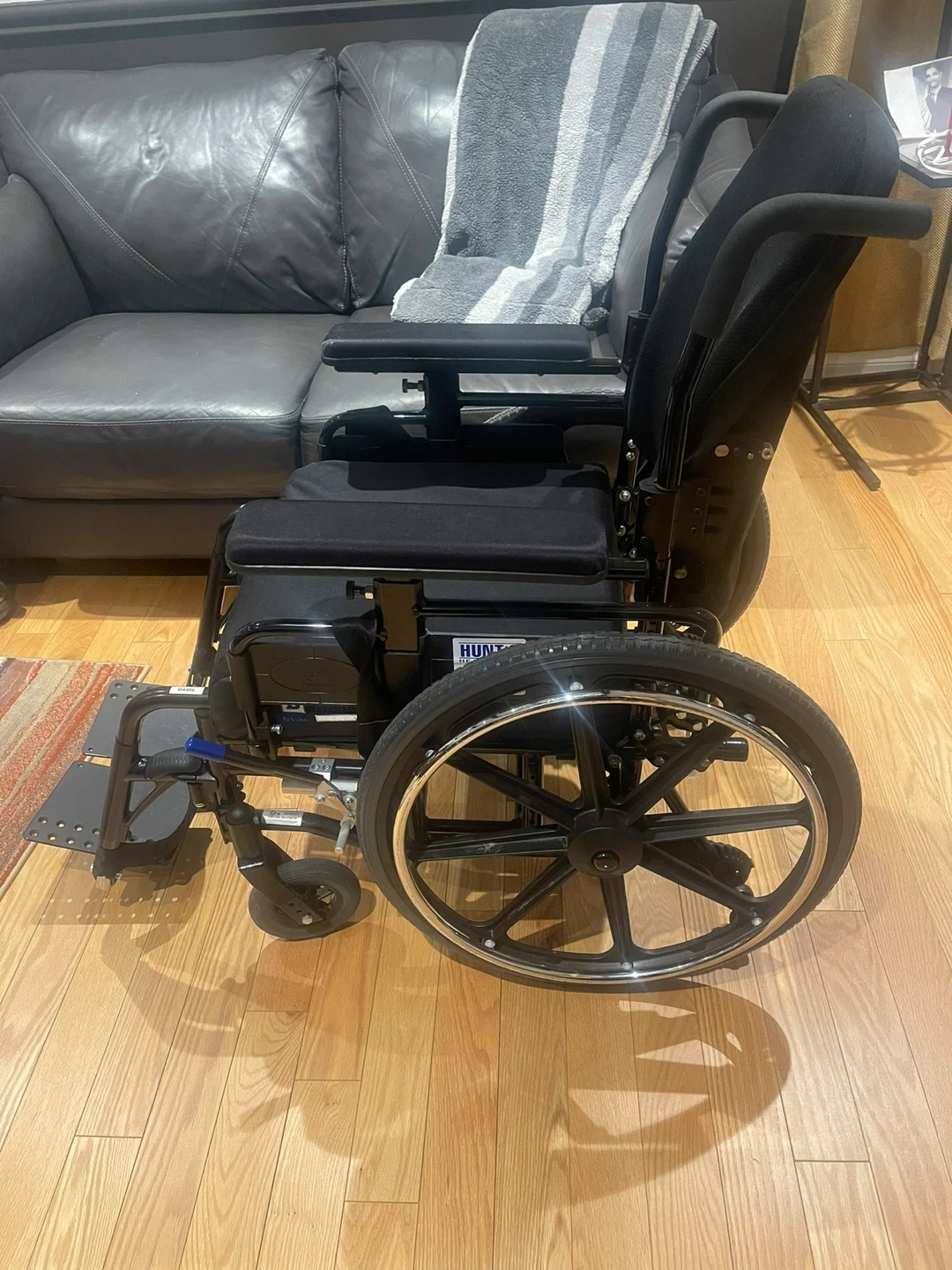 Selling a black wheelchair in great condition. It's perfect for anyone needing mobility assistance. It is lightweight and portable