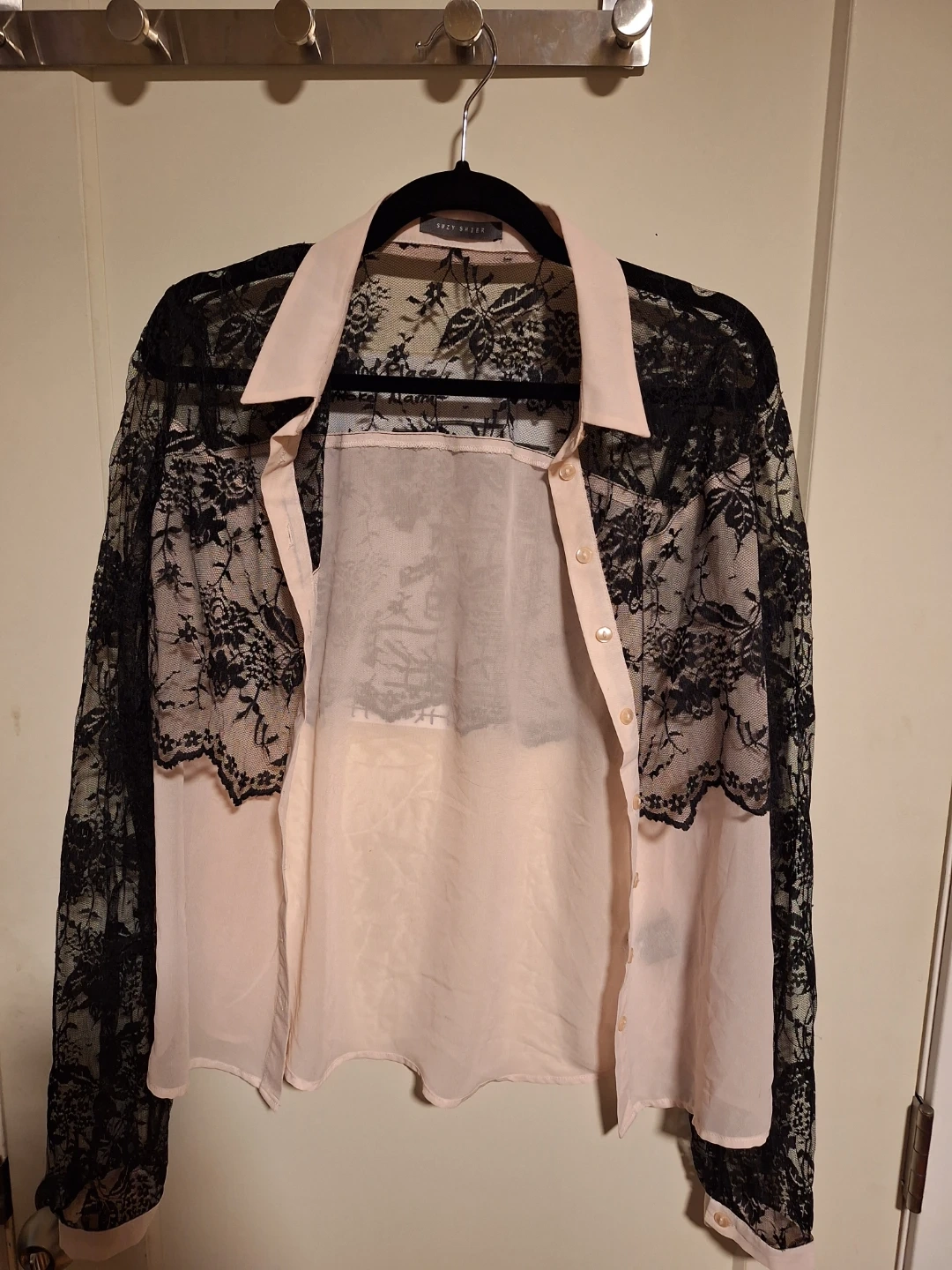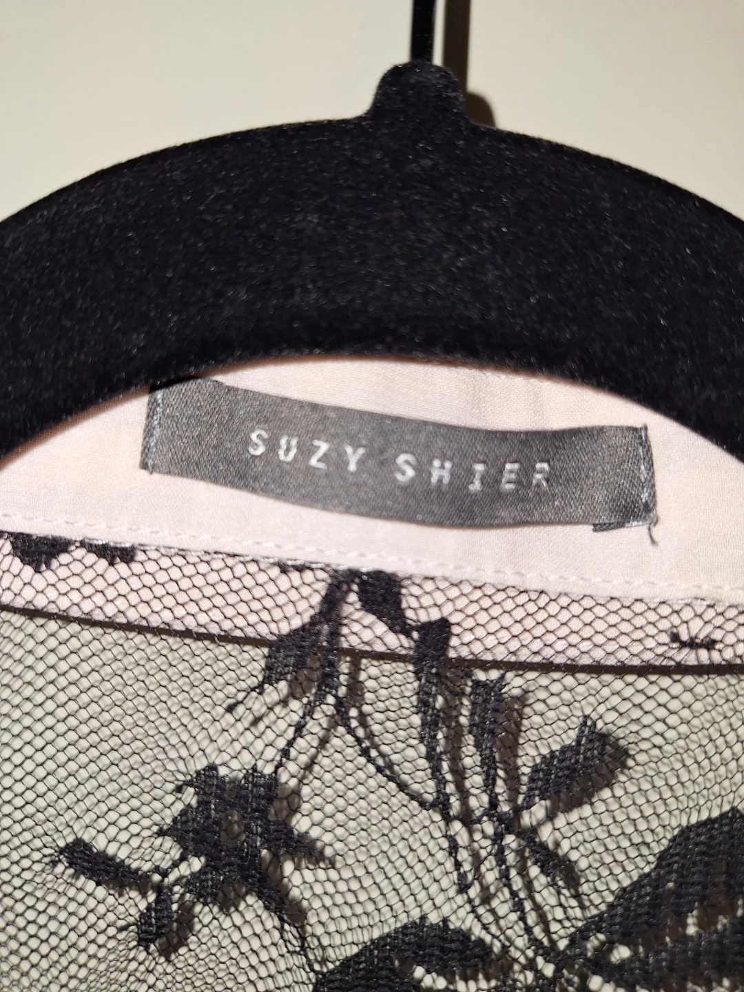 Selling a gently used Suzy Shier blouse. It's a size medium with a pretty lace design. The main material is 100% polyester, with 100% nylon for the trim. Perfect for dressing up or down!