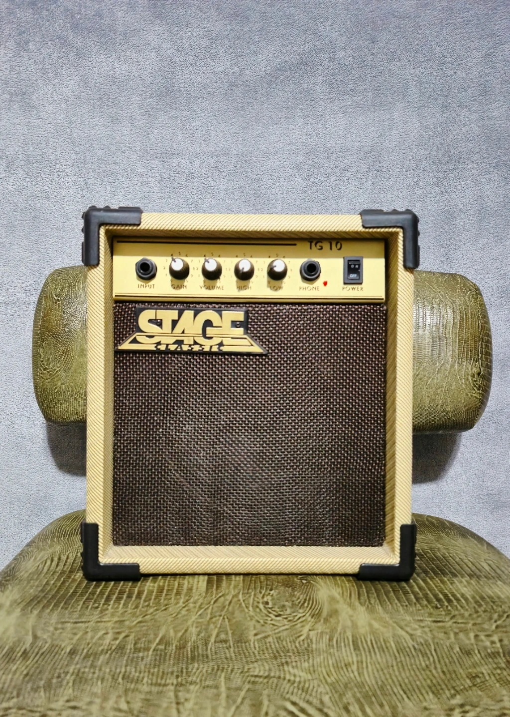 Selling a Stage Right TG-10 guitar amplifier. It's in great shape and ready to use! Perfect for practice or small gigs. It has input, gain, volume, treble, and phone controls.