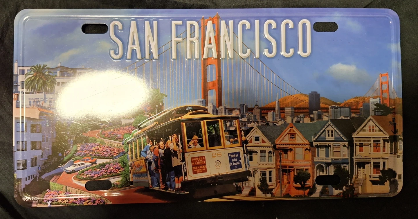 Selling a souvenir license plate featuring a vibrant scene of San Francisco! It shows the Golden Gate Bridge, a cable car, and the famous Victorian houses. A great piece for anyone who loves the city by the bay!