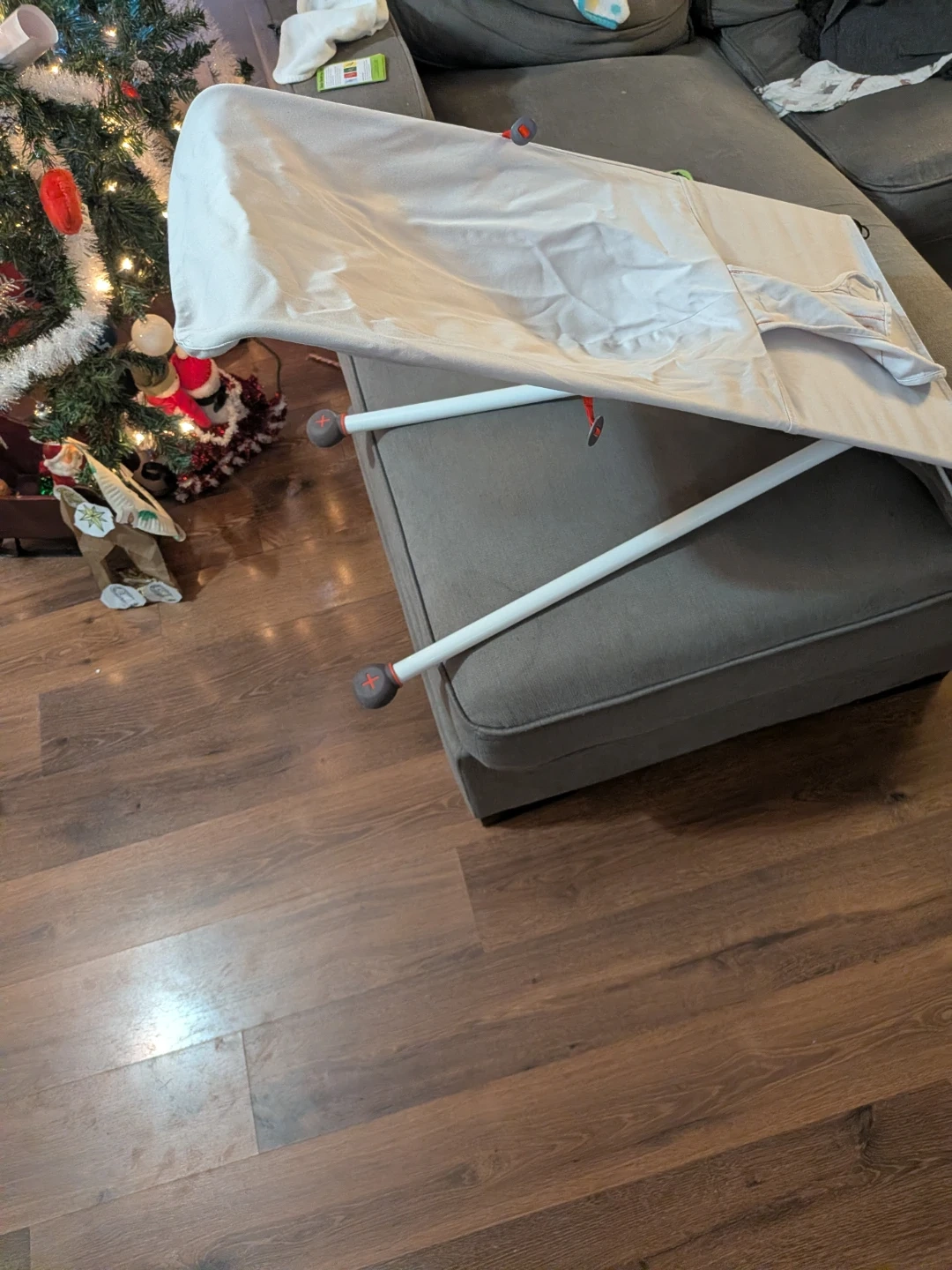 Light grey cover, freshly washed and ready to use.Simple, gentle bounce when baby moves; no batteries needed.