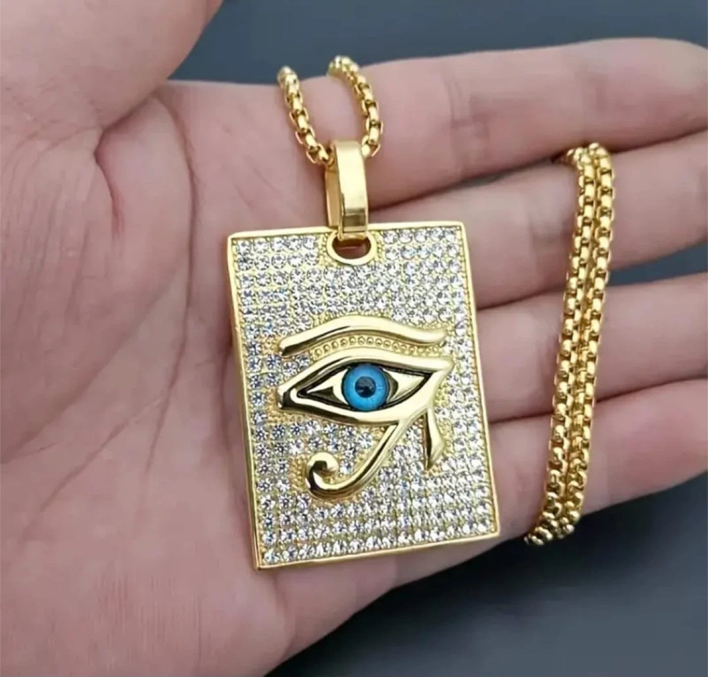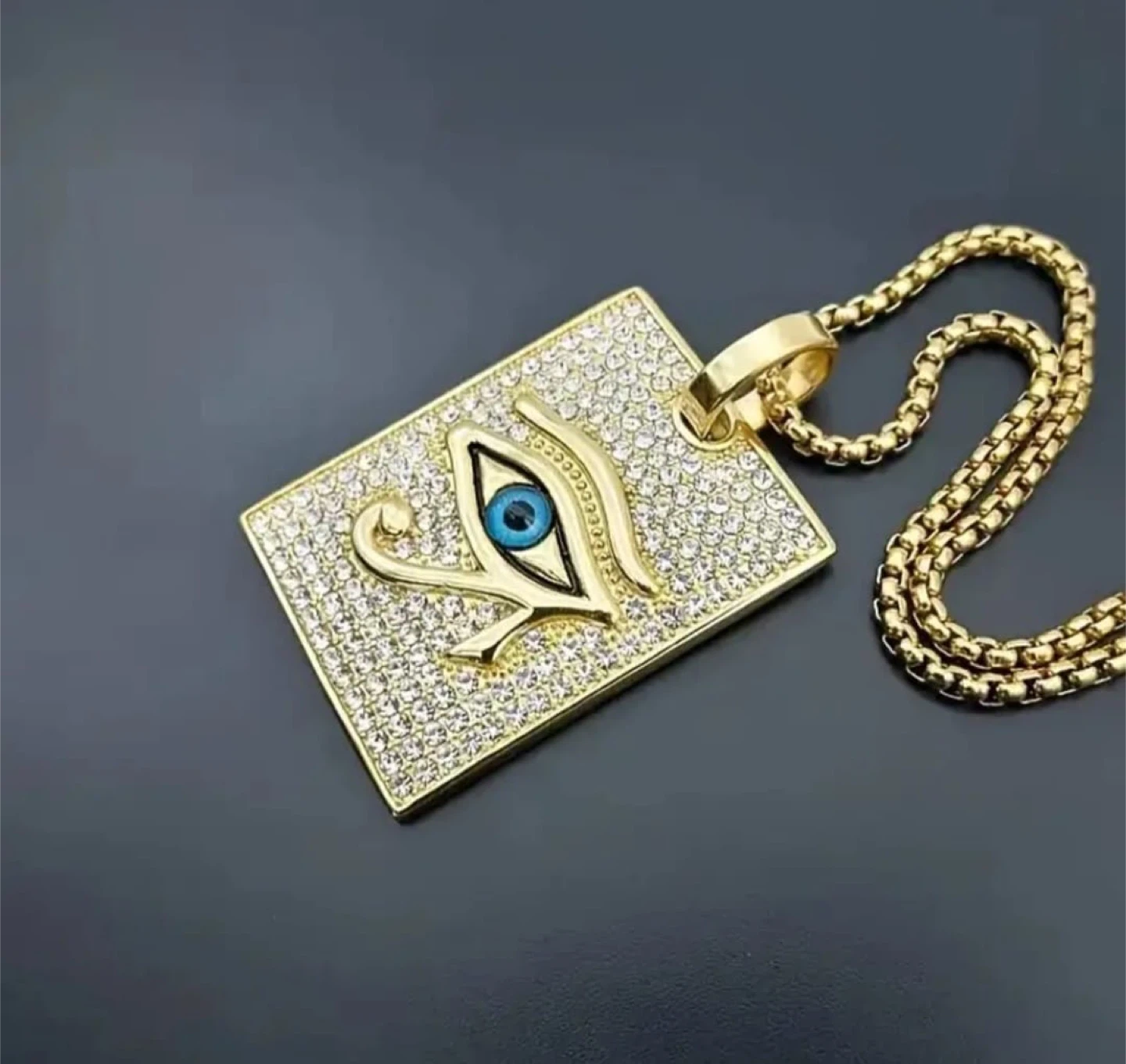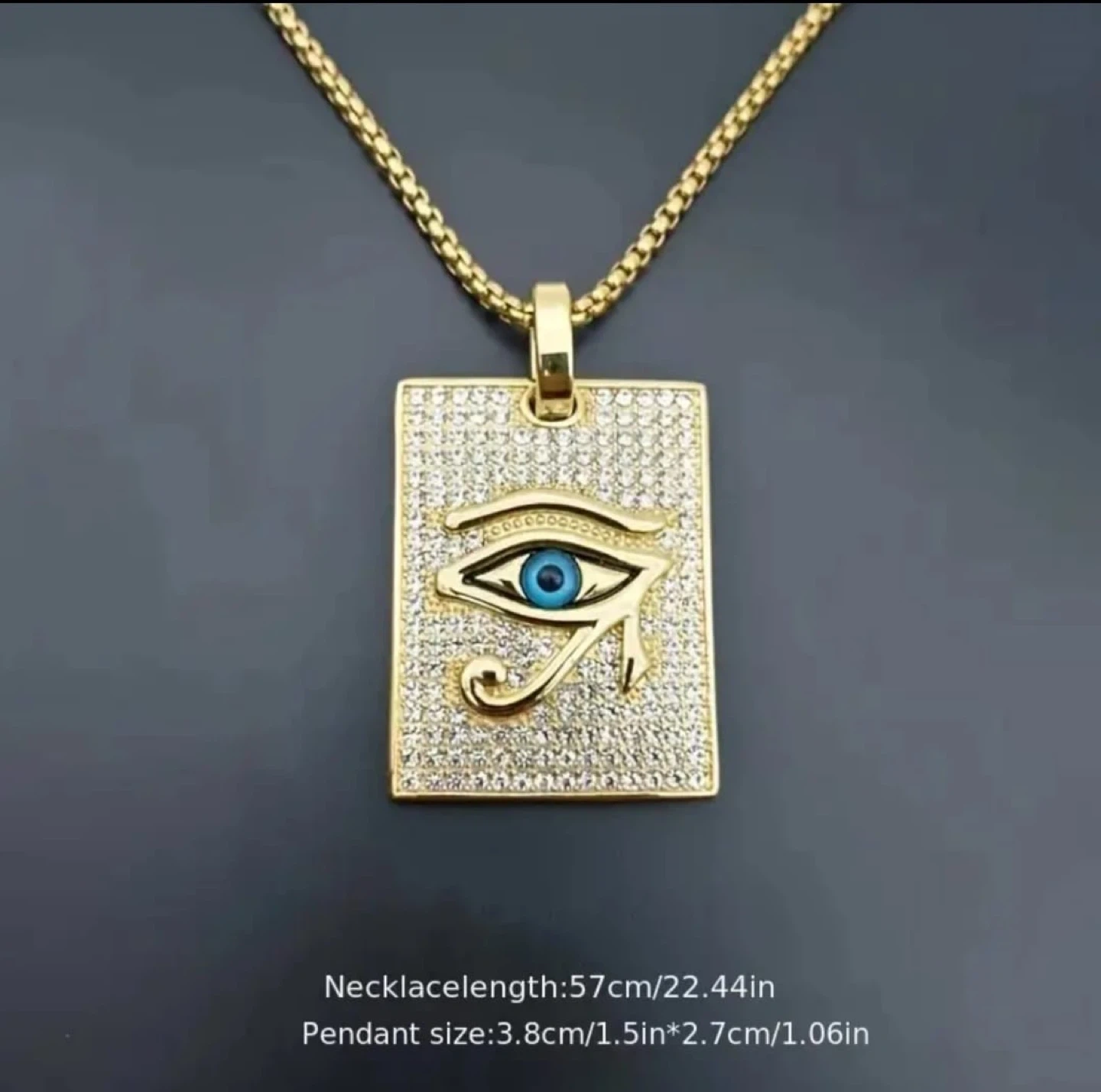 Eye of Horus pendant necklace in a gold tone. The pendant size is 3.8cm/1.5in * 2.7cm/1.06in and the chain length is 57cm/22.44in