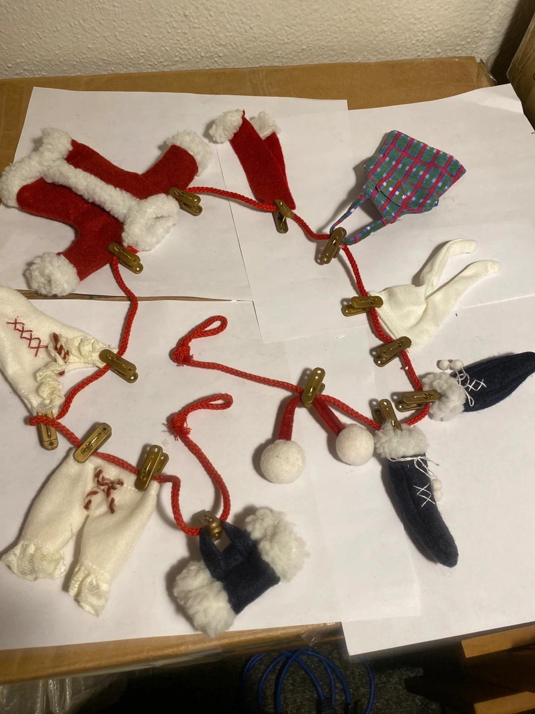 This is a cute miniature clothesline Christmas ornament! It features tiny clothes hanging from a red string with miniature clothespins. Perfect for adding a whimsical touch to your holiday decor… 40” wide