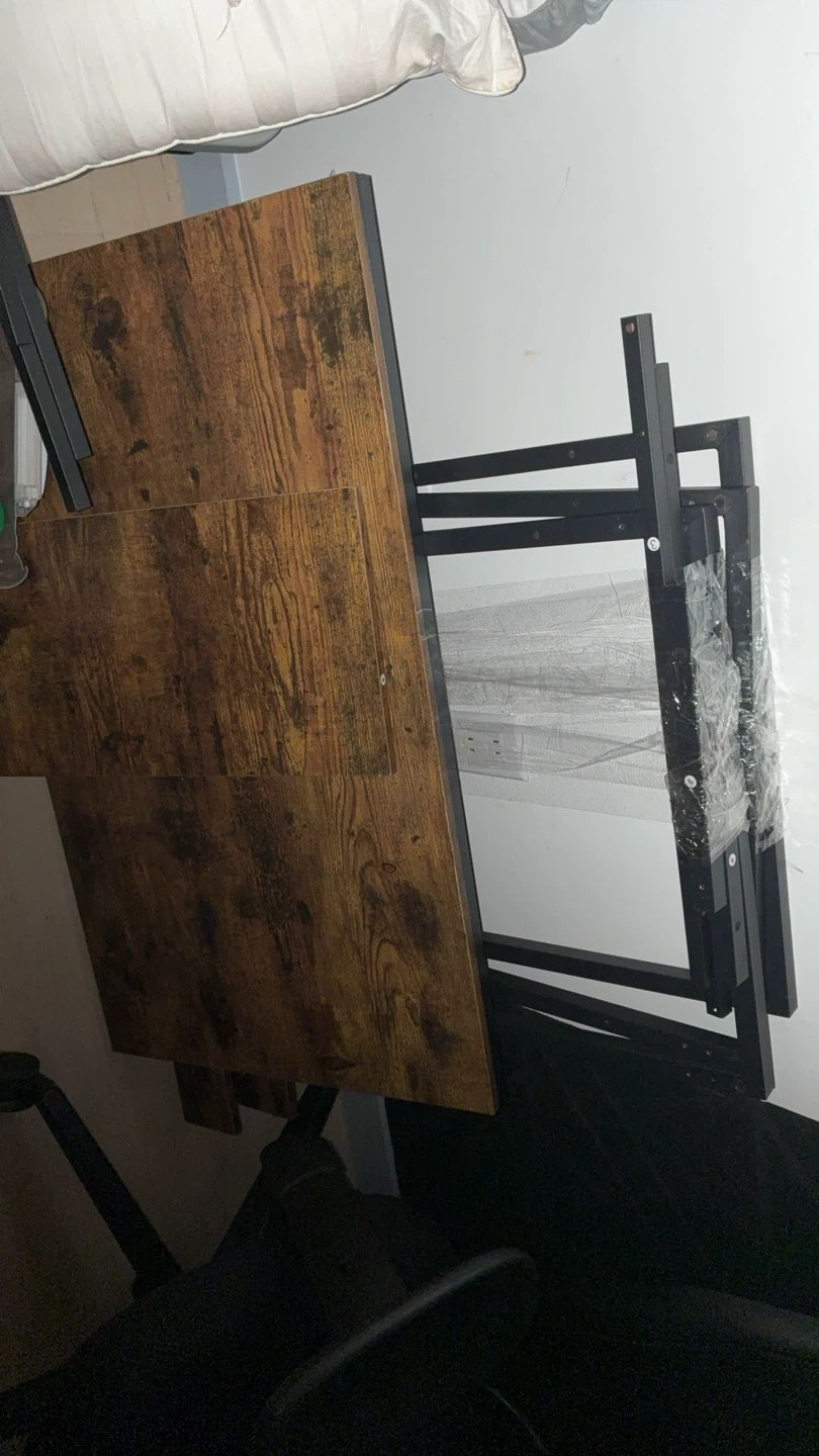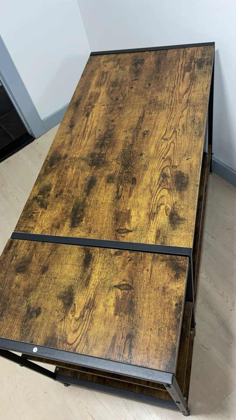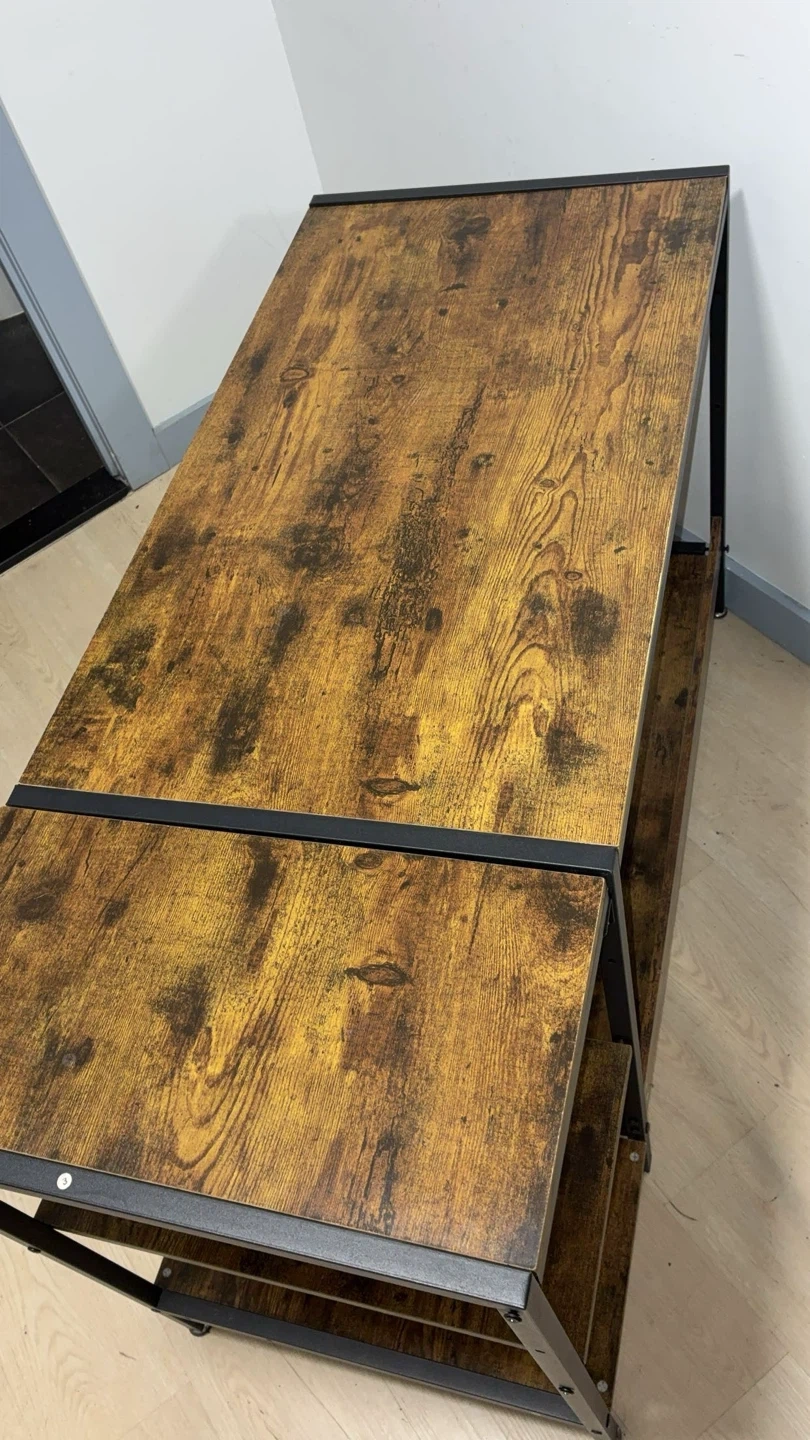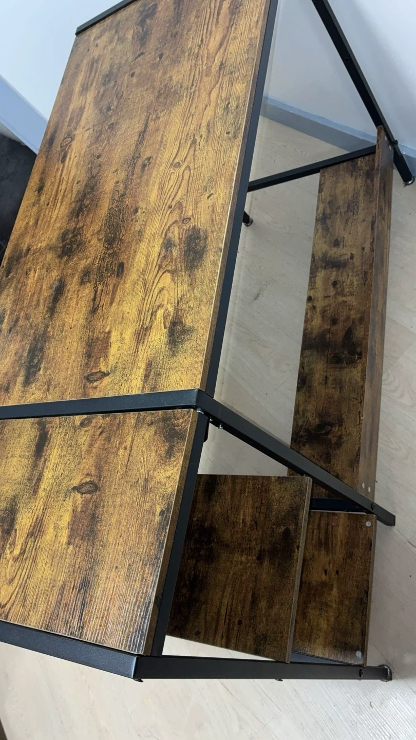 Here's a desk with a wood grain finish and a sturdy black metal frame. It features a unique design with multiple levels for storage or display. The desk appears to be in good condition and ready to add a touch of rustic charm to your workspace