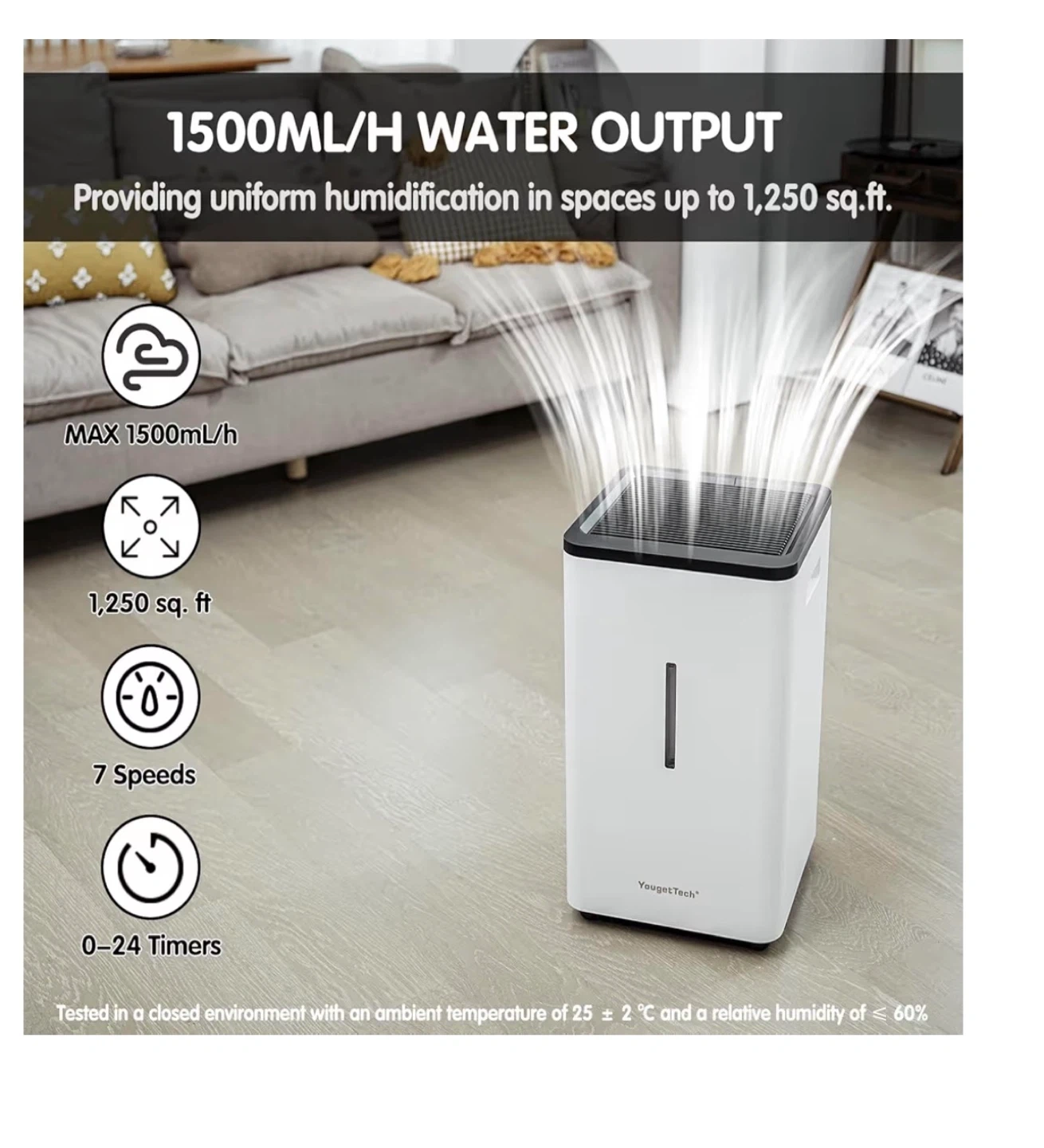 Selling a humidifier! It features a 6.5L water tank and is designed for spaces up to 1,250 sq ft. It also has whisper-quiet operation, perfect for maintaining a quiet environment. The humidifier has 7 speeds.