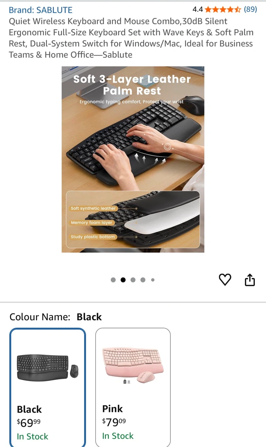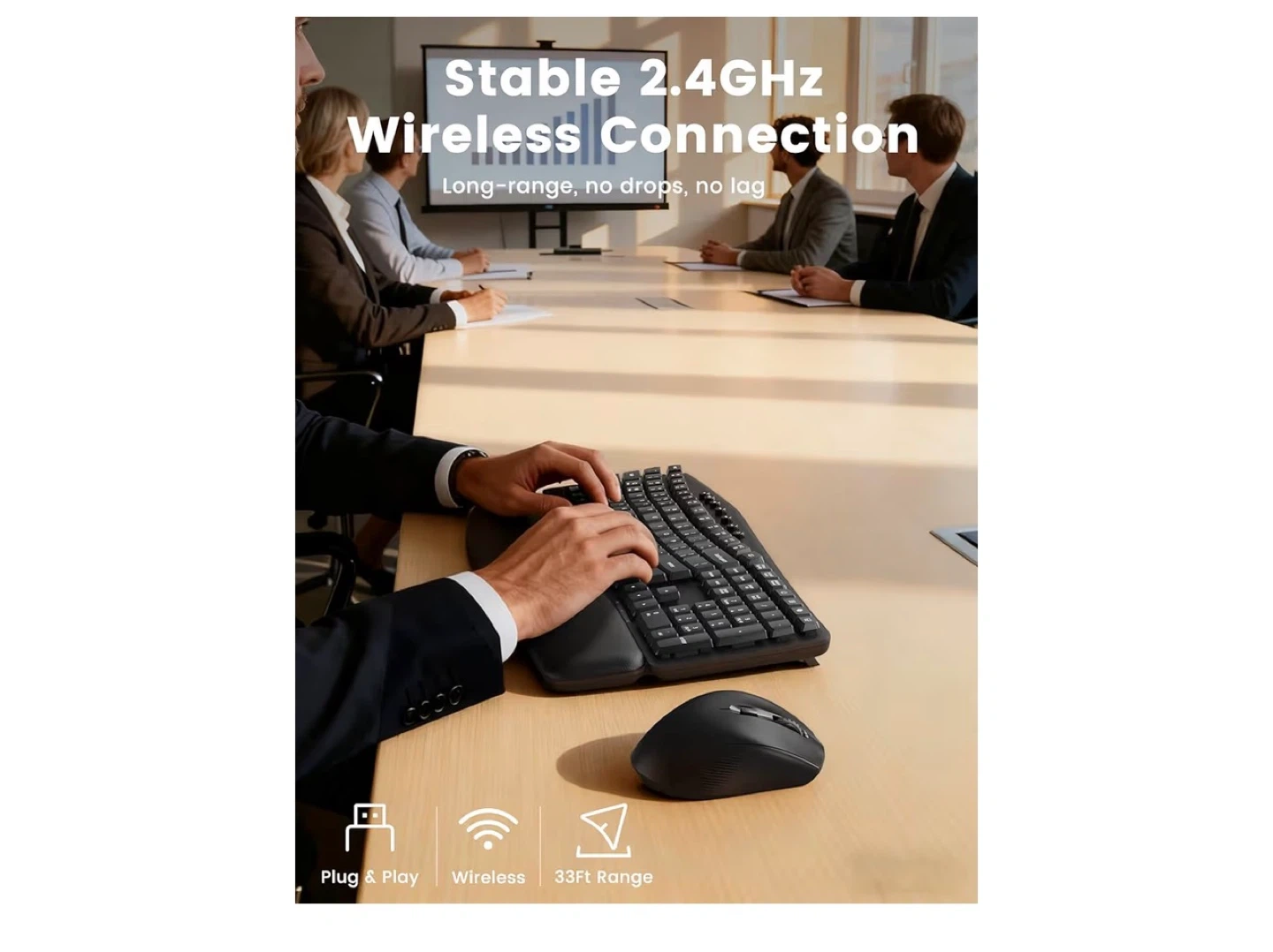wireless keyboard and mouse combo in black. This set features a 30dB silent ergonomic full-size keyboard with wave keys and a soft 3-layer leather palm rest.