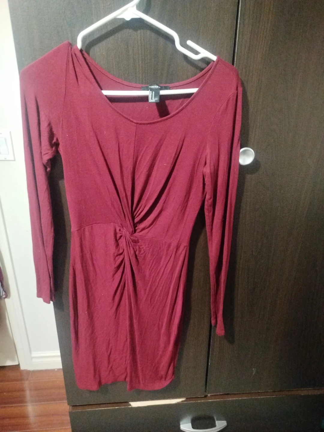 Selling a Forever 21 long sleeve dress in burgundy. It's a size large and features a stylish knot detail at the front. Perfect for a night out or a casual day!