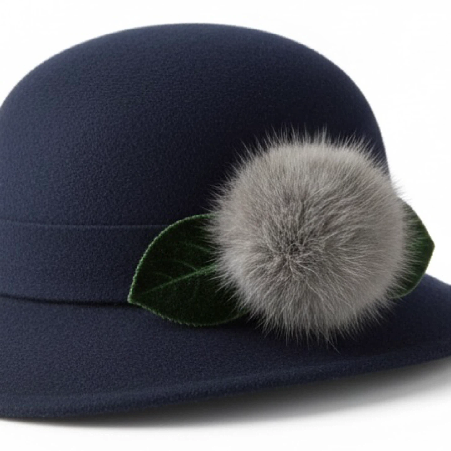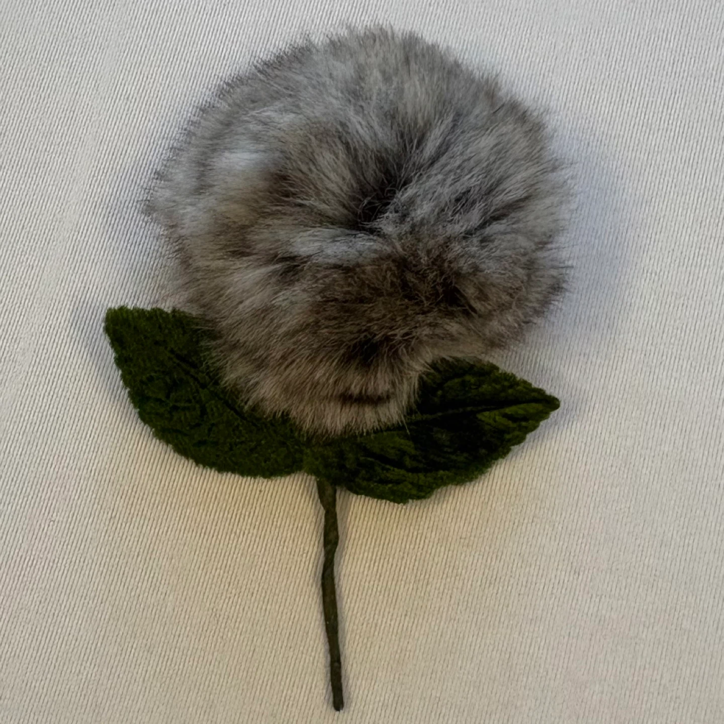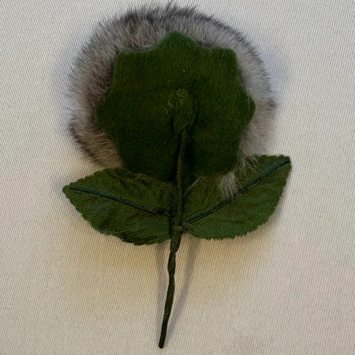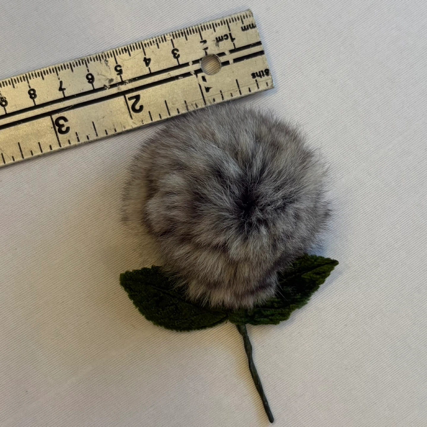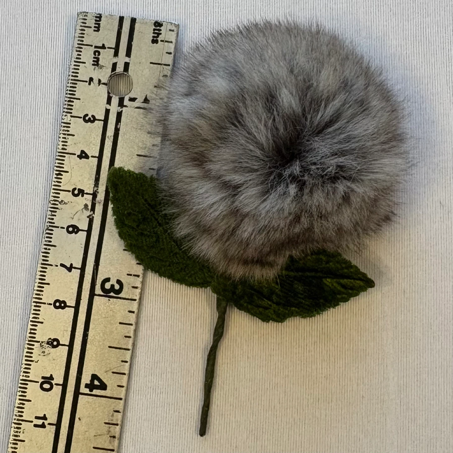 1950s real fur decorative flower accessory. Features a soft grey fur pompom with dark green velvet leaves and a wrapped stem. Perfect for vintage collectors, millinery projects, or to add a luxurious retro touch to a coat, jacket, or handbag. Note: Item does not have a pin-back attached but one could be added fairly easily.