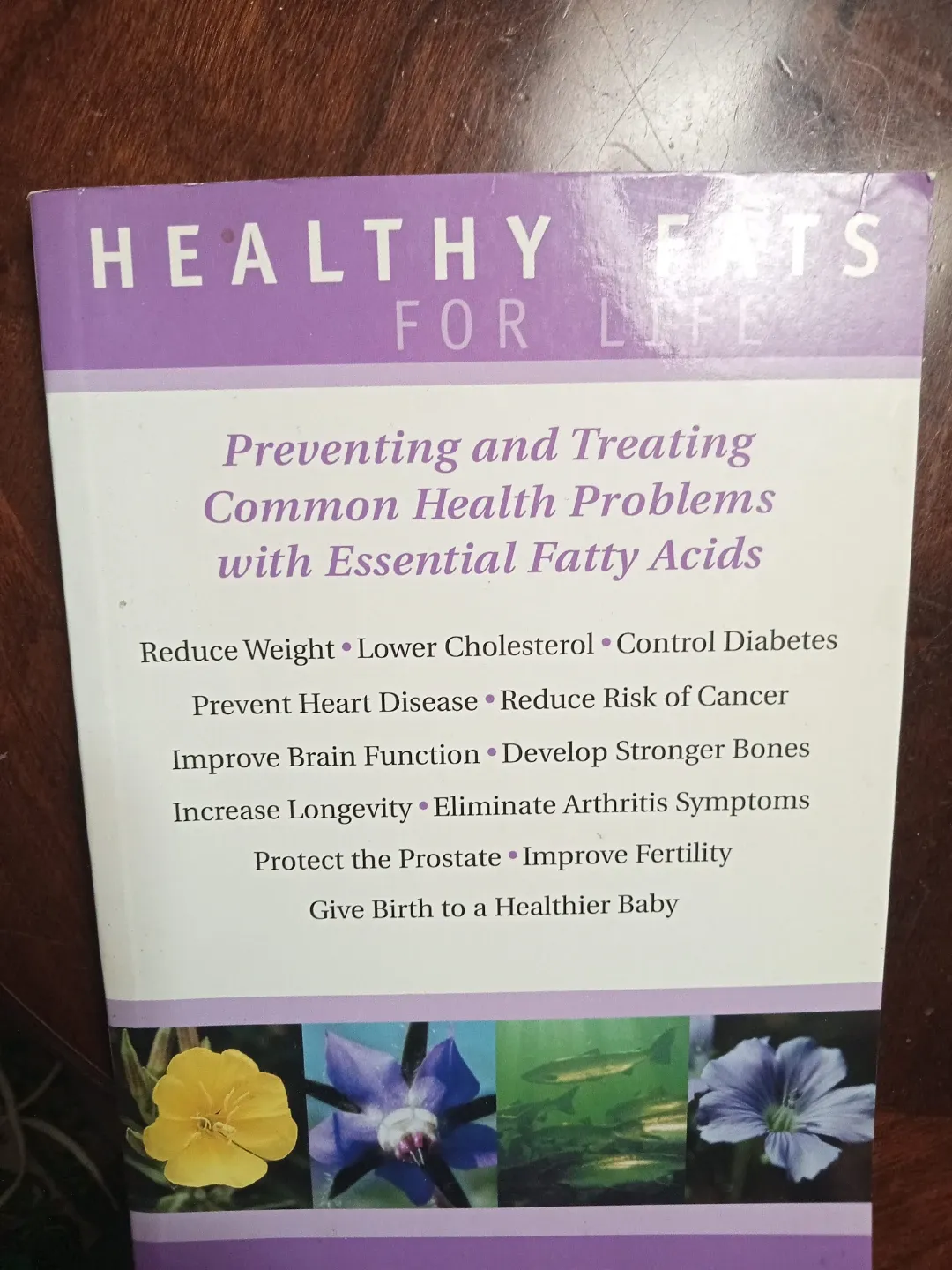Selling a book titled 'Healthy Fats for Life'. It focuses on preventing and treating common health problems with essential fatty acids. The book covers topics like reducing weight, lowering cholesterol, controlling diabetes, preventing heart disease, and reducing the risk of cancer. It also discusses improving brain function, developing stronger bones, increasing longevity, eliminating arthritis symptoms, protecting the prostate, improving fertility, and giving birth to a healthier baby
