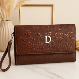 This is a stylish brown clutch featuring a distinctive 'D' detail on the front.