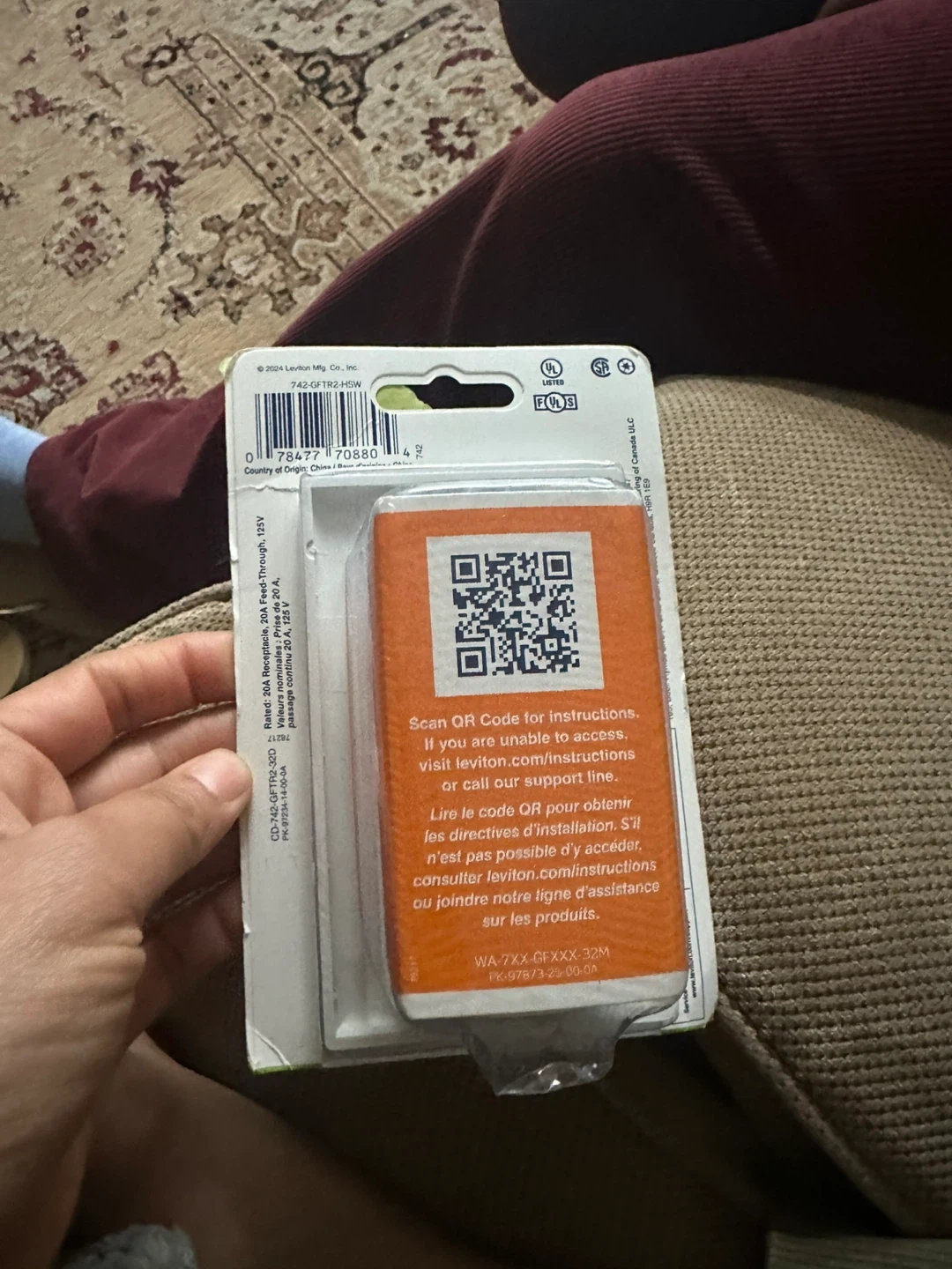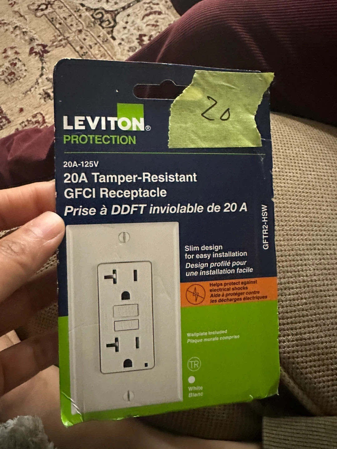 Selling a Leviton 20A Tamper-Resistant GFCI Receptacle. It's designed for easy installation and has a slim profile. The wallplate is included. It is white.
