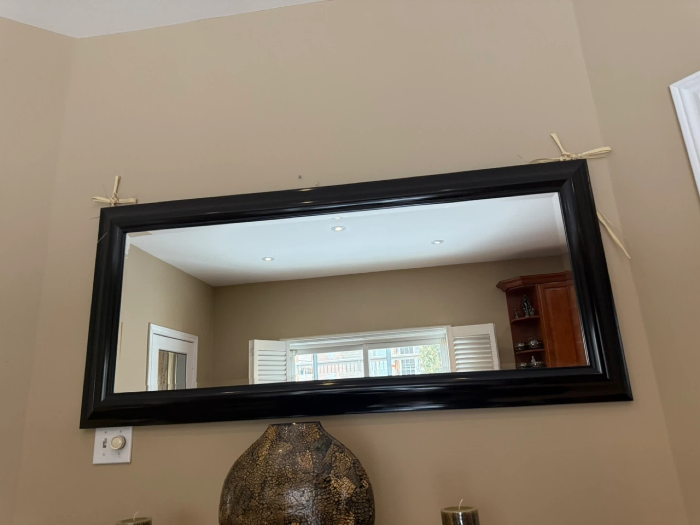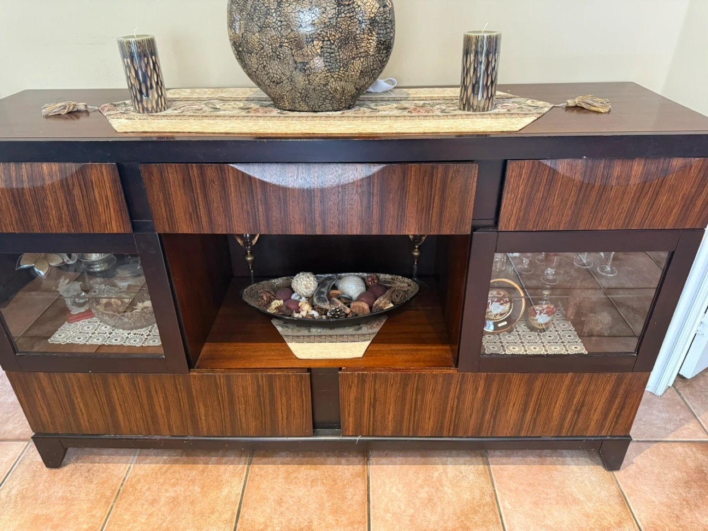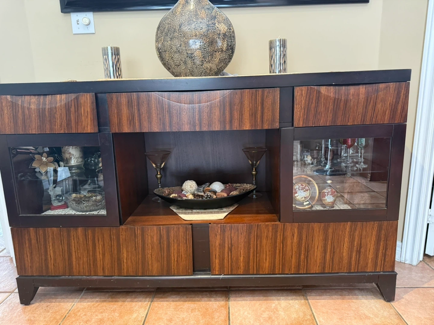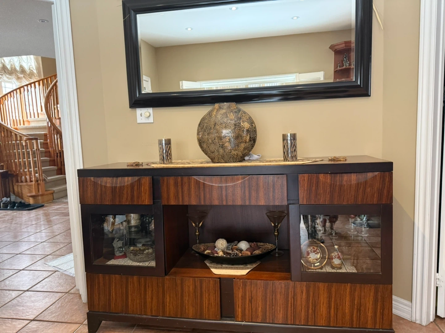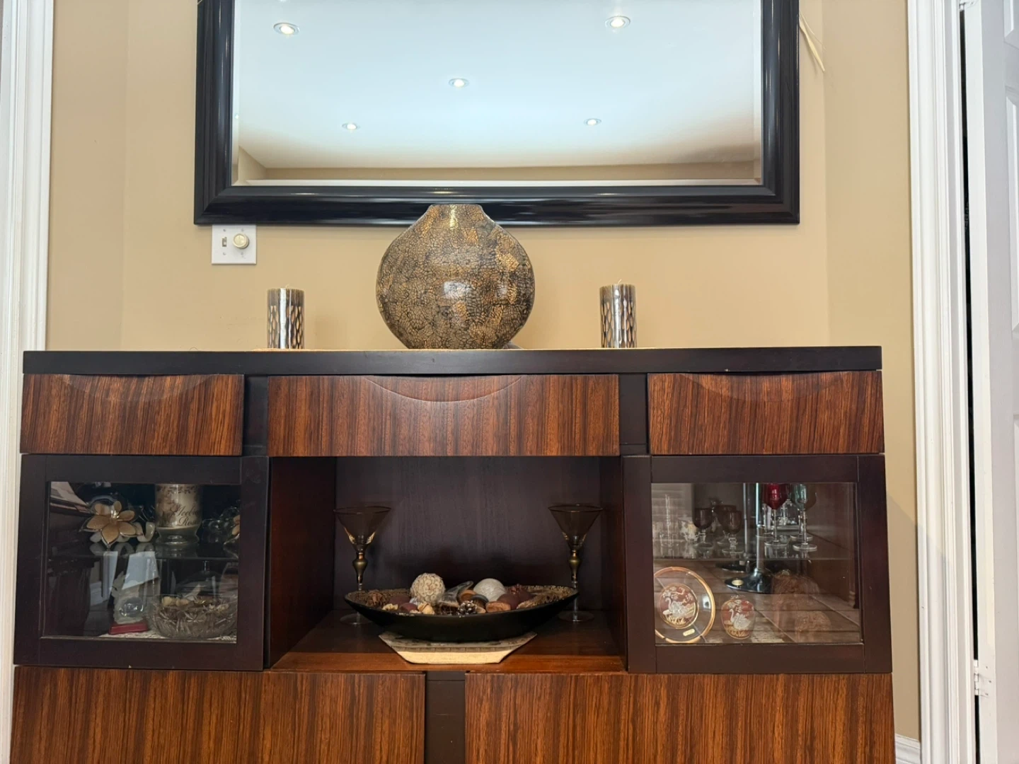 Selling a lovely wooden display cabinet with a matching mirror. It's in good condition and would look great in any dining or living room. The cabinet has glass display sections and plenty of storage space. The mirror has a black frame.
