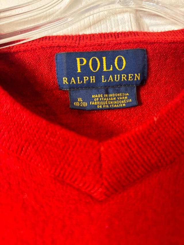 $35 or Best Offer - Classic Polo Ralph Lauren V-neck sweater in a bold red colour. Made from 100% wool with a soft, warm knit and timeless fit. Features the embroidered Polo logo on the chest. A versatile piece that works for casual wear, layering, or business-casual outfits. Details: