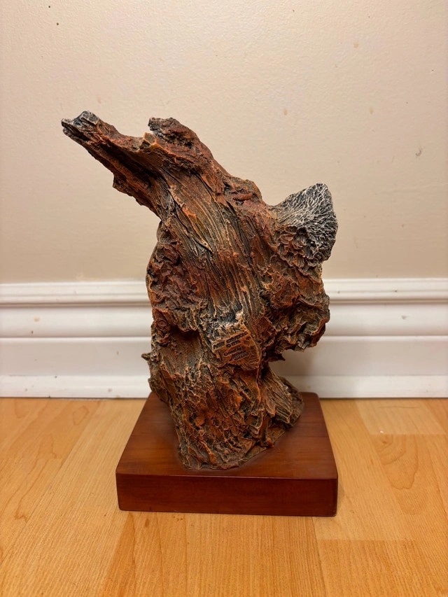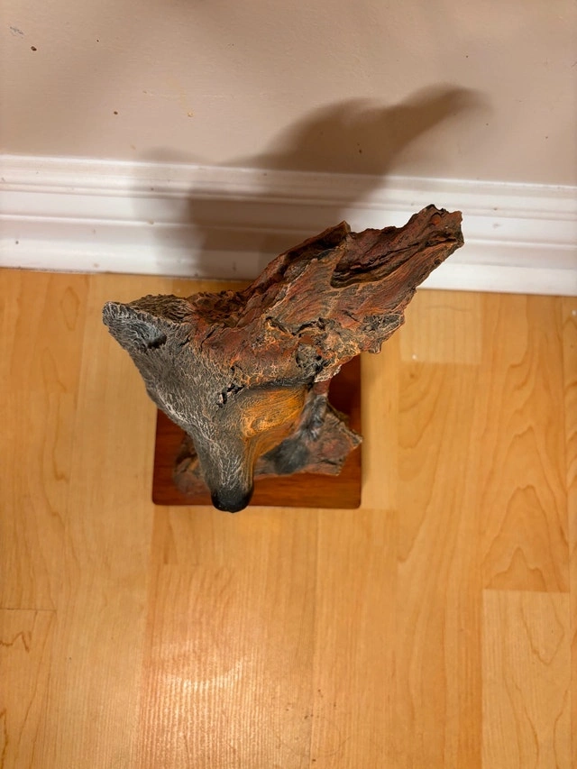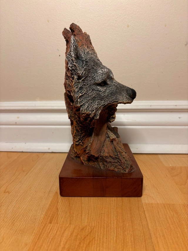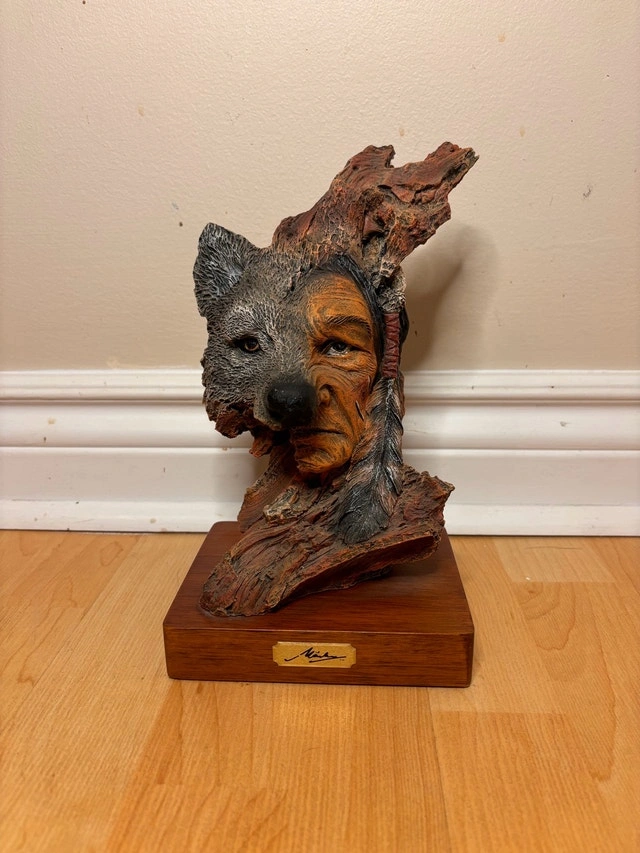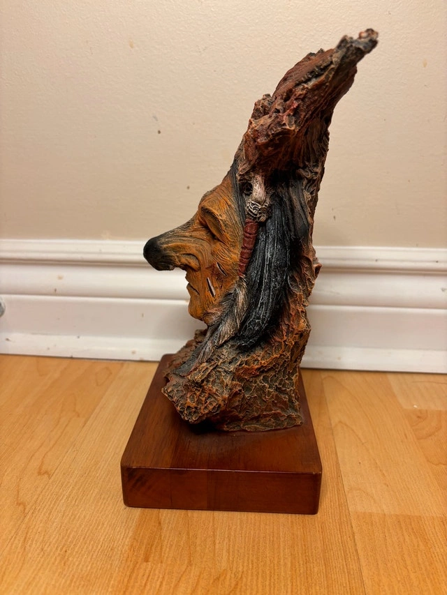 $90 or best offer - Beautiful one-of-a-kind unbelievable resin sculpture depicting a powerful human and wolf transformation. The design uses natural, bark-like textures and technical facial detail to create a striking dual-image effect that changes depending on the viewing angle. This is a high-quality decorative art piece has a signed name plate with strong visual presence and symbolism, perfect as a statement piece. Details: • Sculpted resin (not wood) • Signed nameplate • Excellent condition • Approx. dimensions: 10” length 5” height Great for collectors of beautiful things, spiritual or symbolic décor.