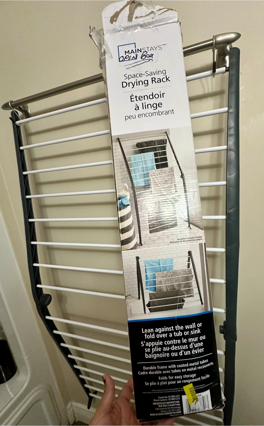 Selling a New open box Mainstays space-saving drying rack in excellent condition! It's perfect for small spaces and can lean against the wall or fold over a tub or sink.