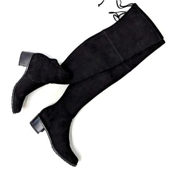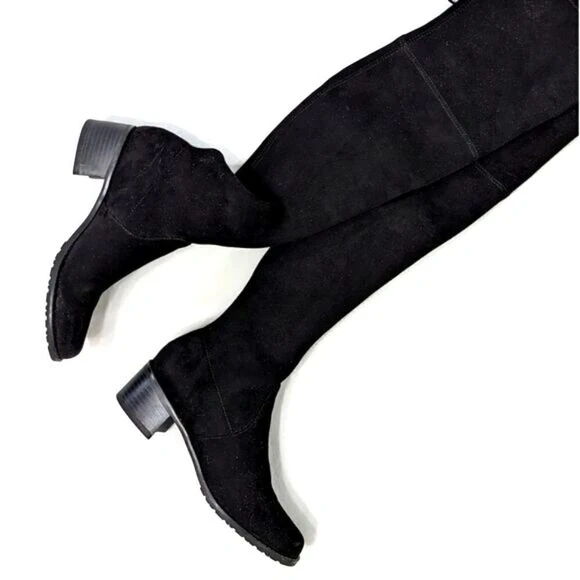Construction & quality is on par with Stuart Weitzman only difference being this is a vegan black suede upper. Very nice thick slightly stretchy poly suede upper.