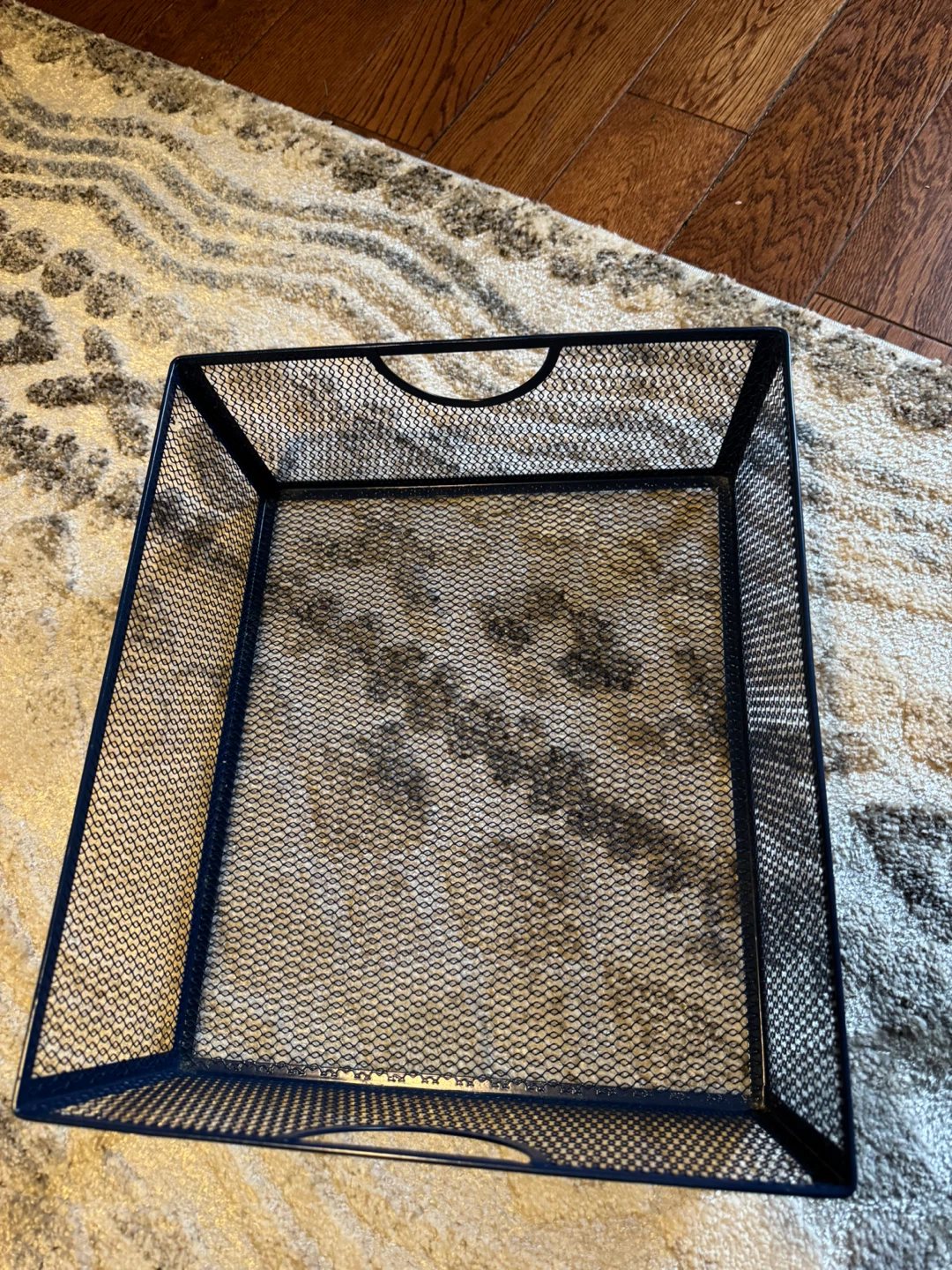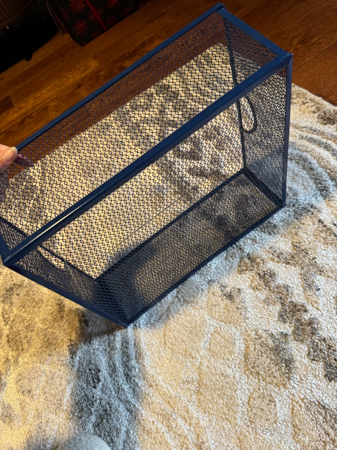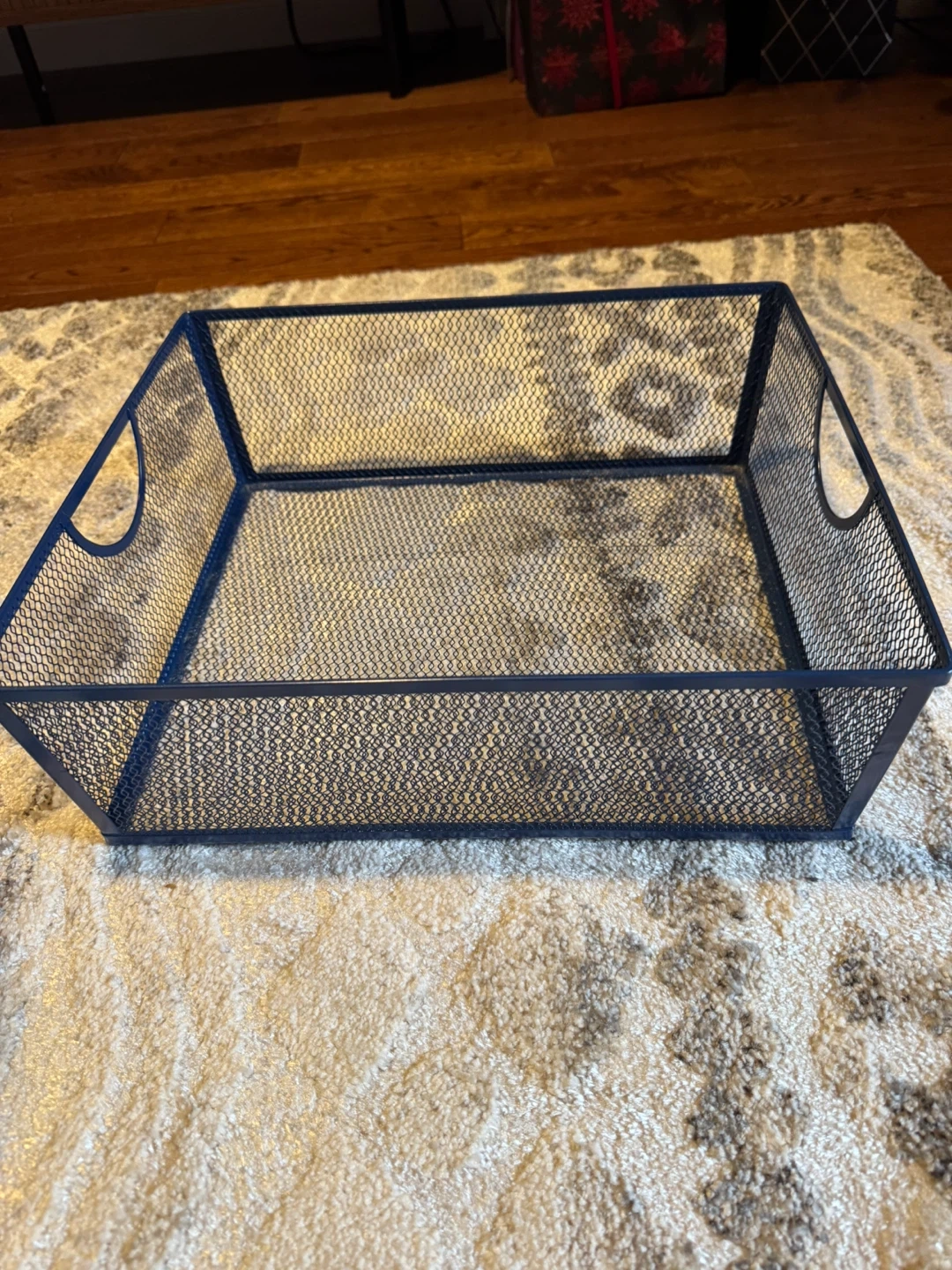 Here is a blue mesh storage basket. It's in great shape and ready to help you organize your space! Perfect for decluttering and keeping things tidy