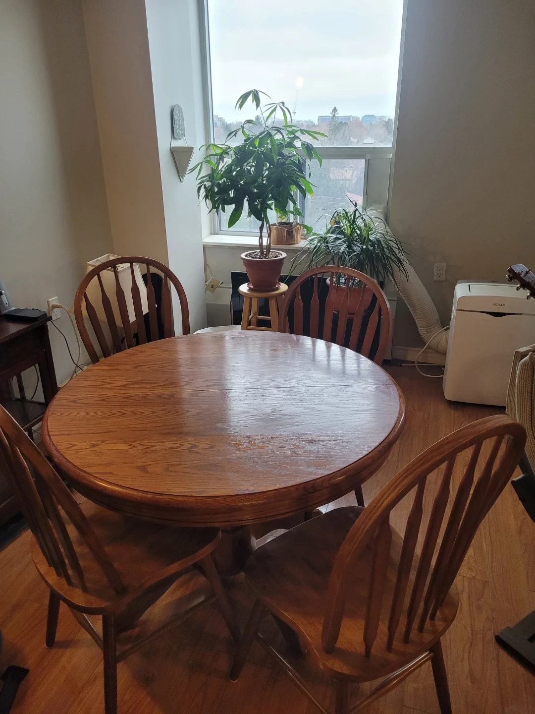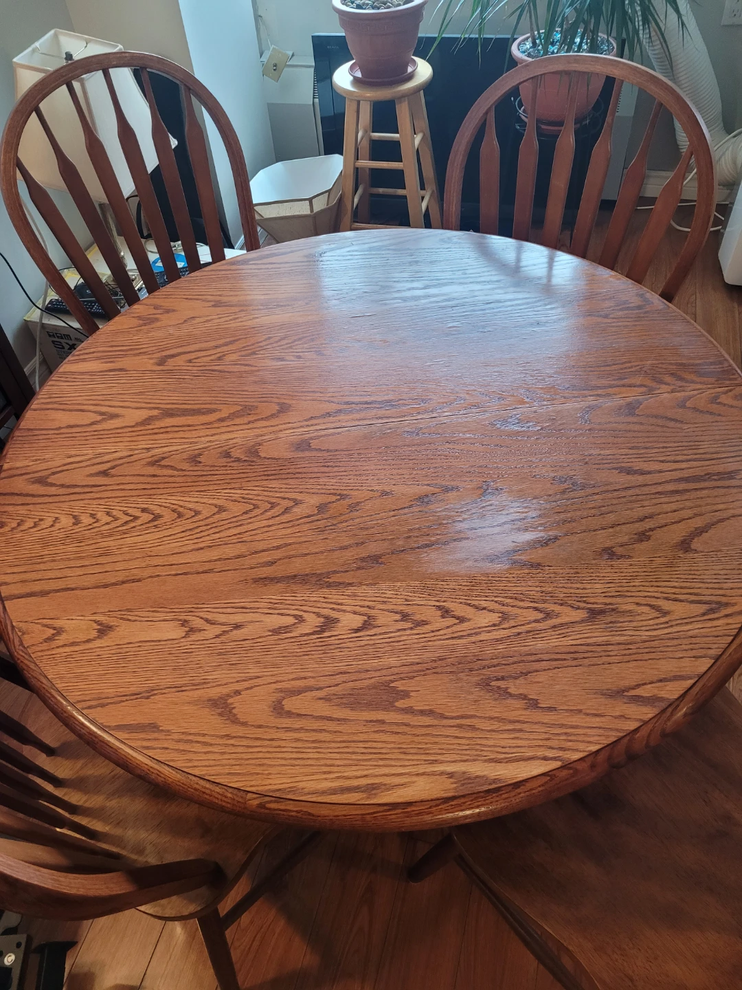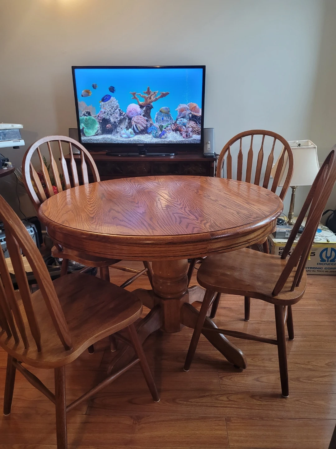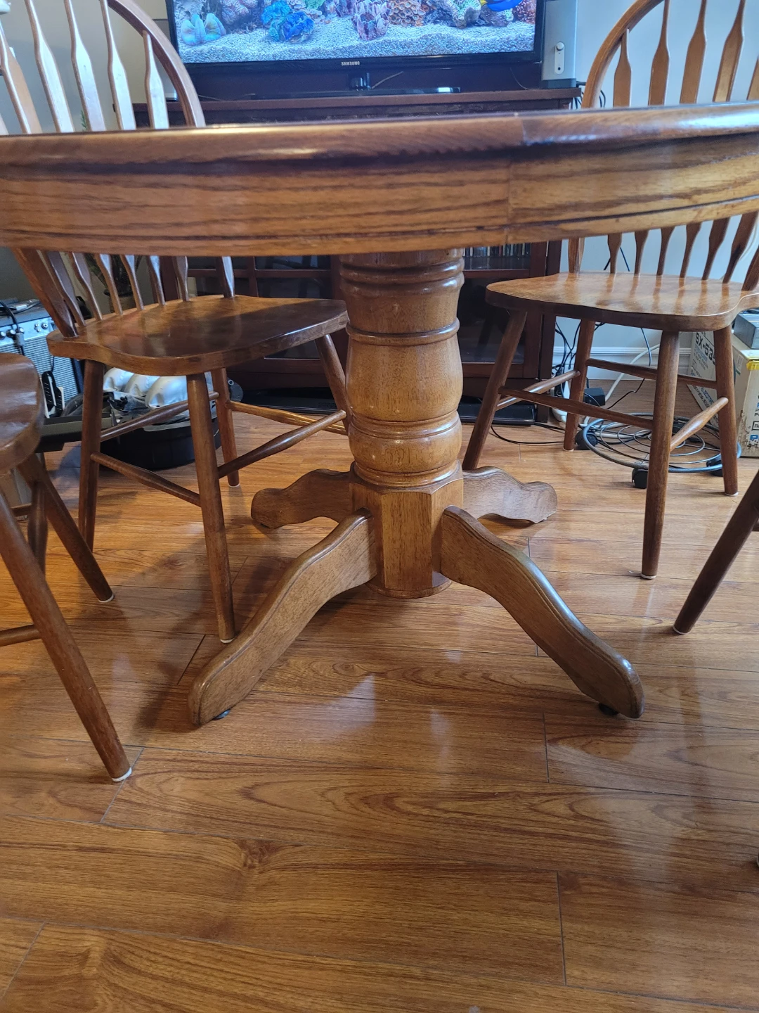 Selling a round oak dining table with four matching chairs. It's a sturdy set and perfect for a smaller dining area. The table has a classic design and the chairs are comfortable. A great addition to any home!
