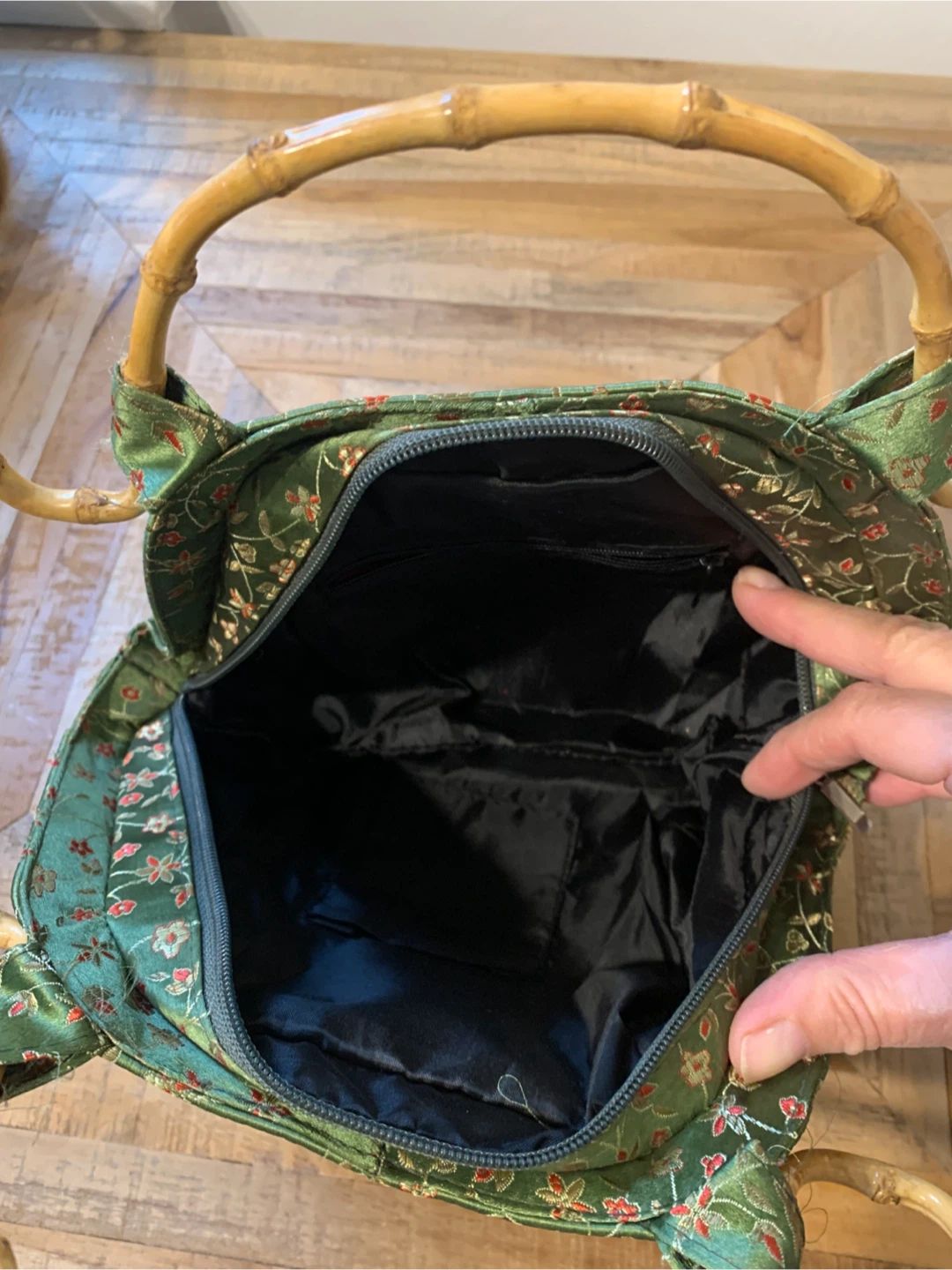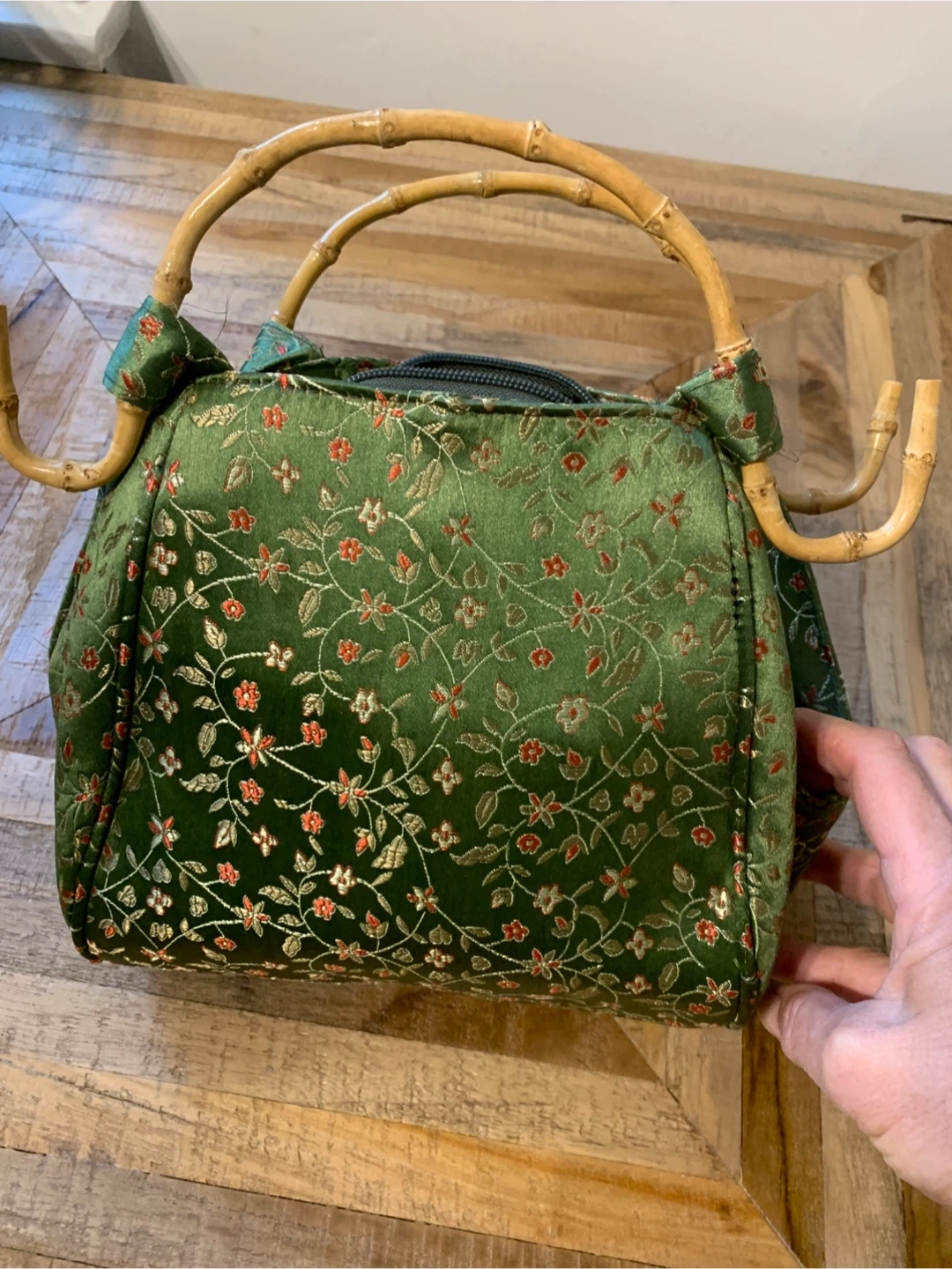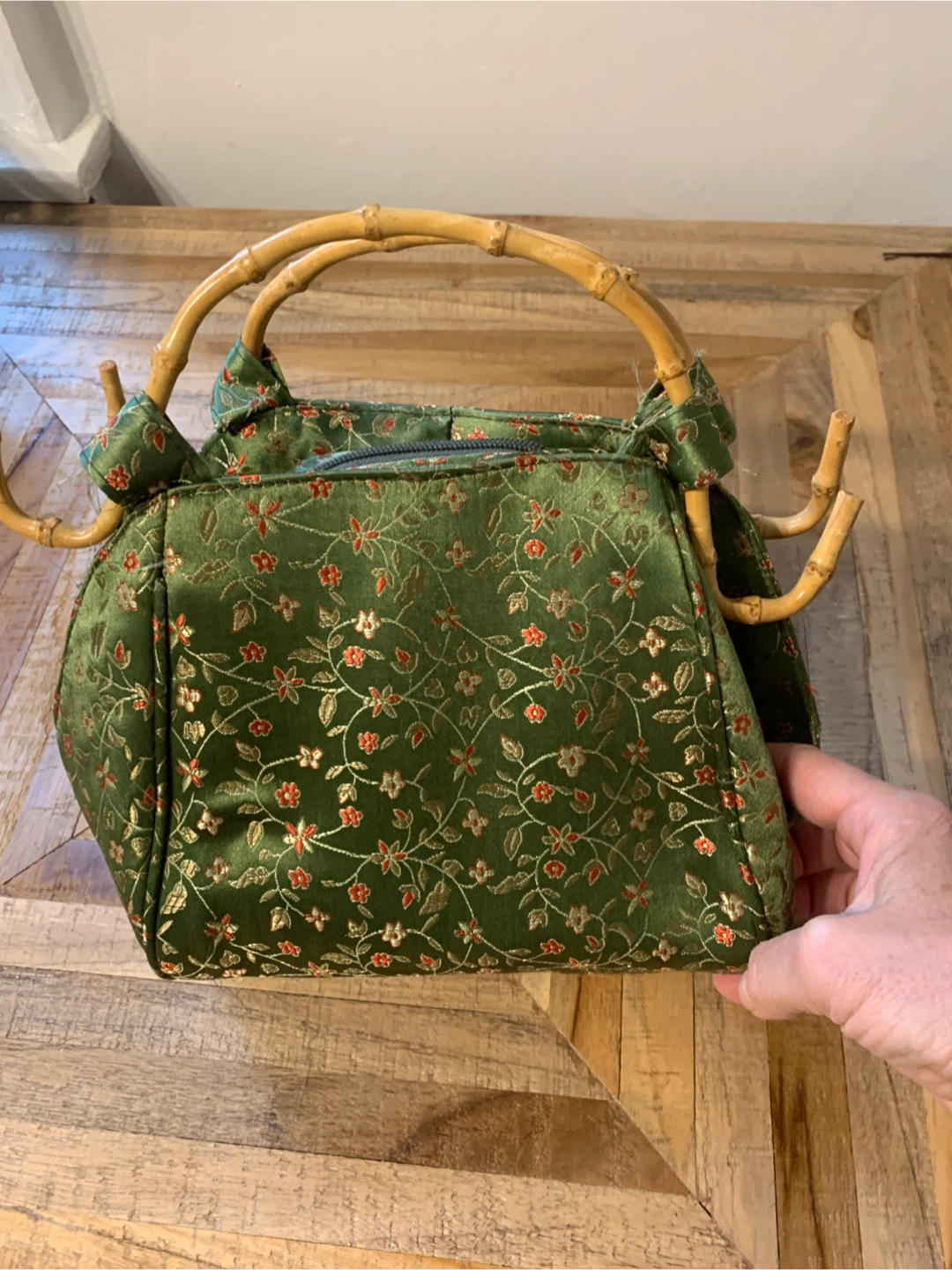 This is a cute green handbag with a floral pattern and unique bamboo handles. It's in great condition and ready for a new owner!