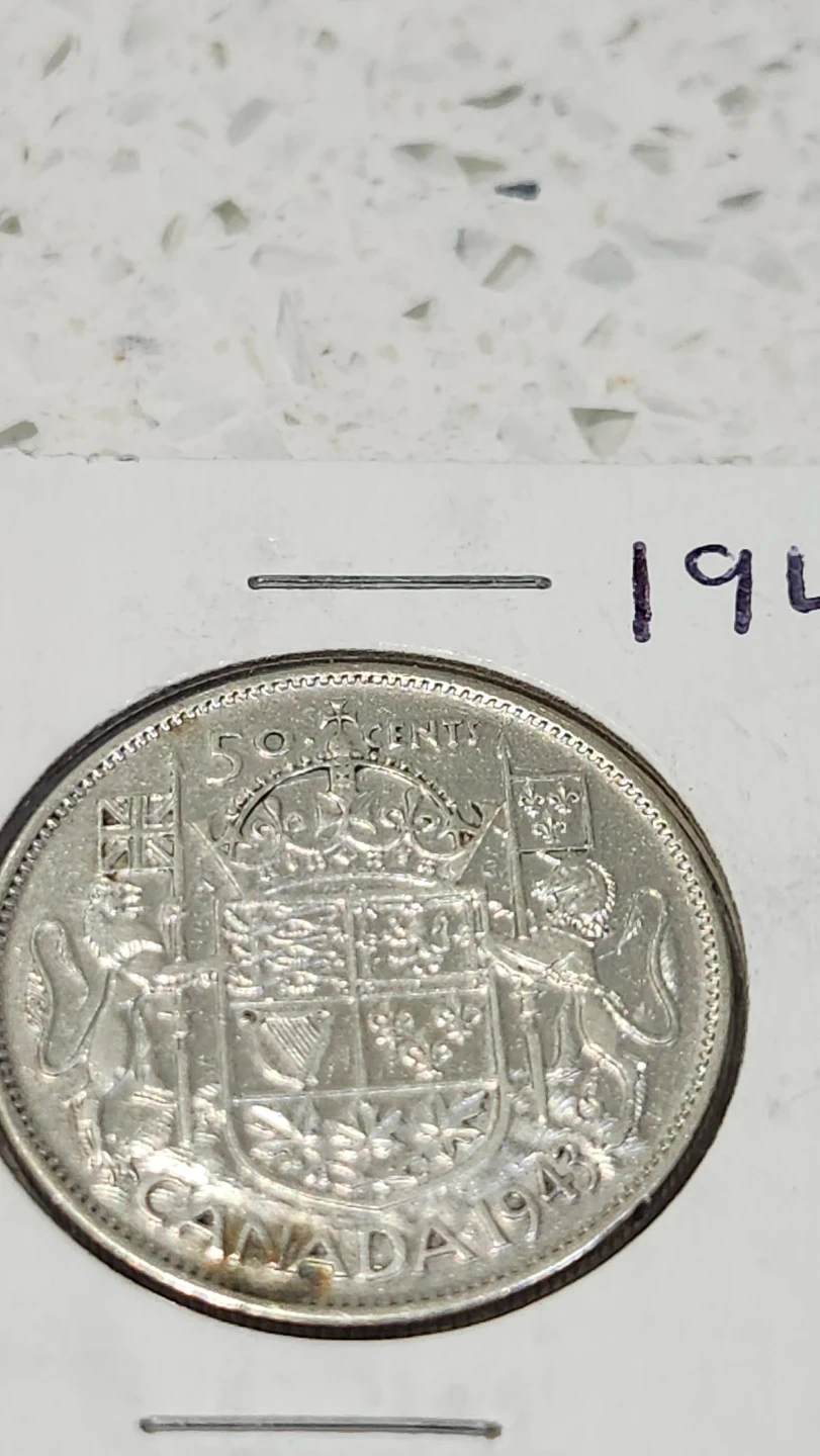 Selling a 1943 Canadian 50 cent coin. Condition: Looking at , the coin appears to be in Very Fine (VF) to Extremely Fine (EF) condition. It shows clear details in the crown and the shield, though there is some light wear on the high points and some minor toning/spotting at the bottom near "CANADA."