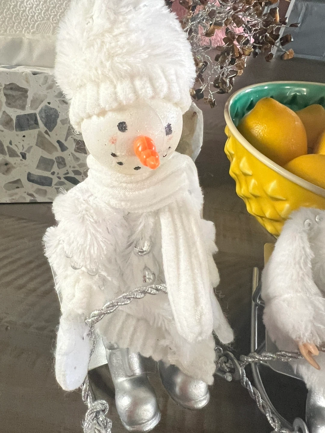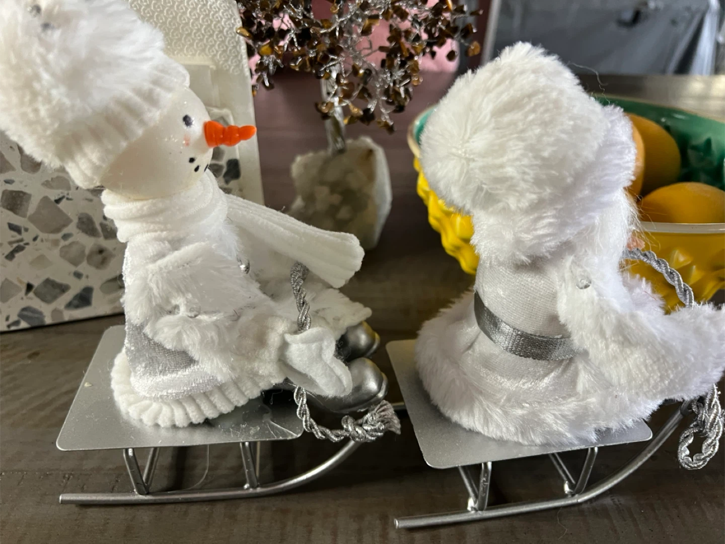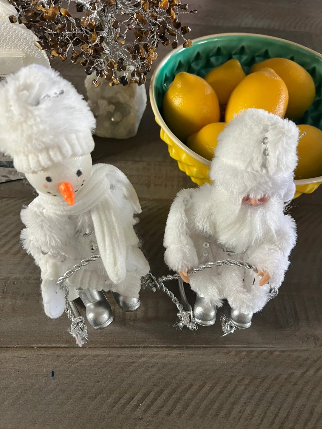 These cute winter figurines are perfect for adding a touch of holiday cheer to your home! They feature a snowman and Santa Claus riding on sleighs, all decked out in fluffy white outfits. They're in great condition and ready to bring some festive spirit to your space