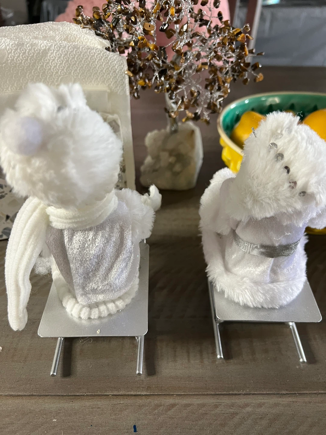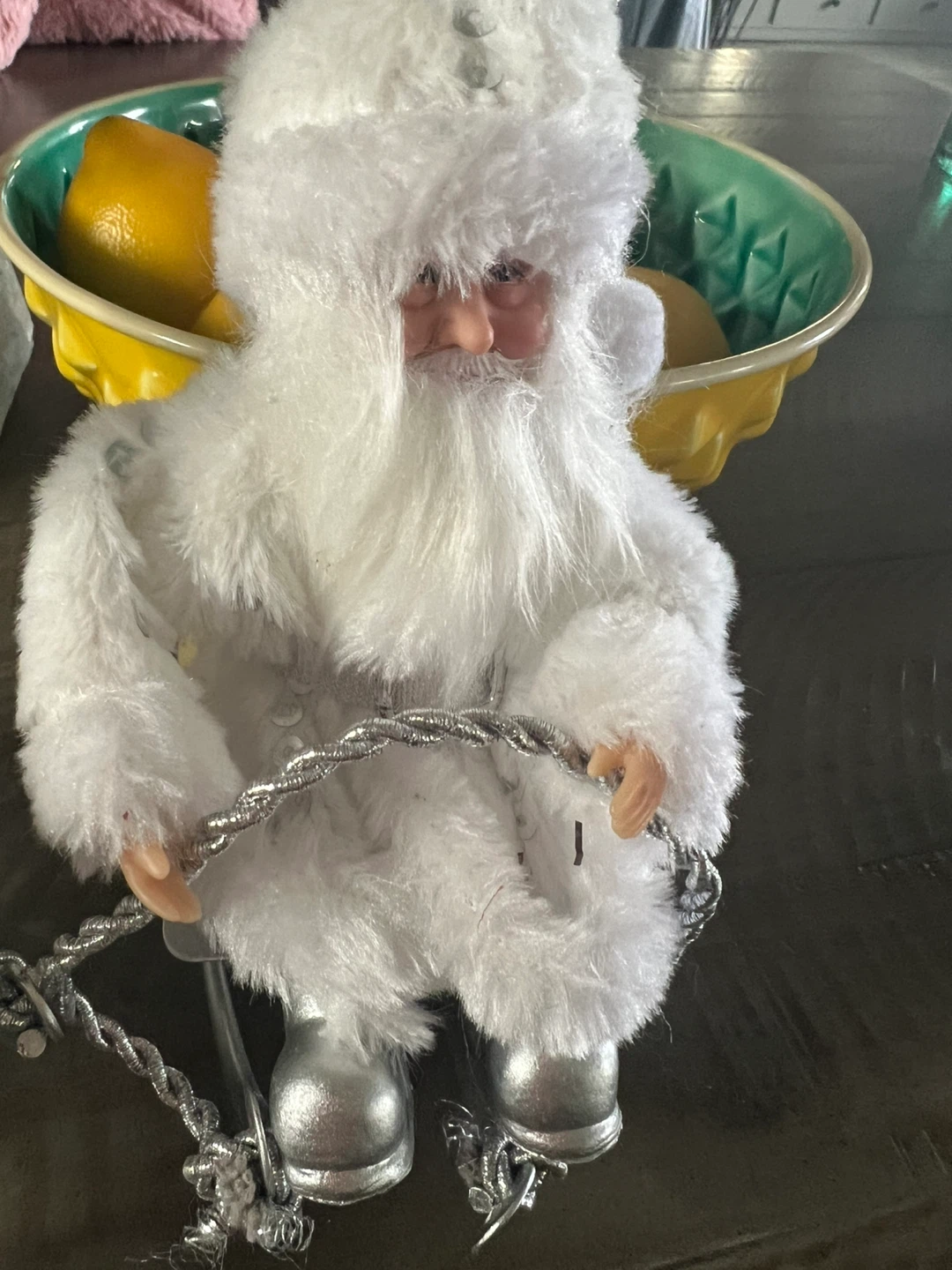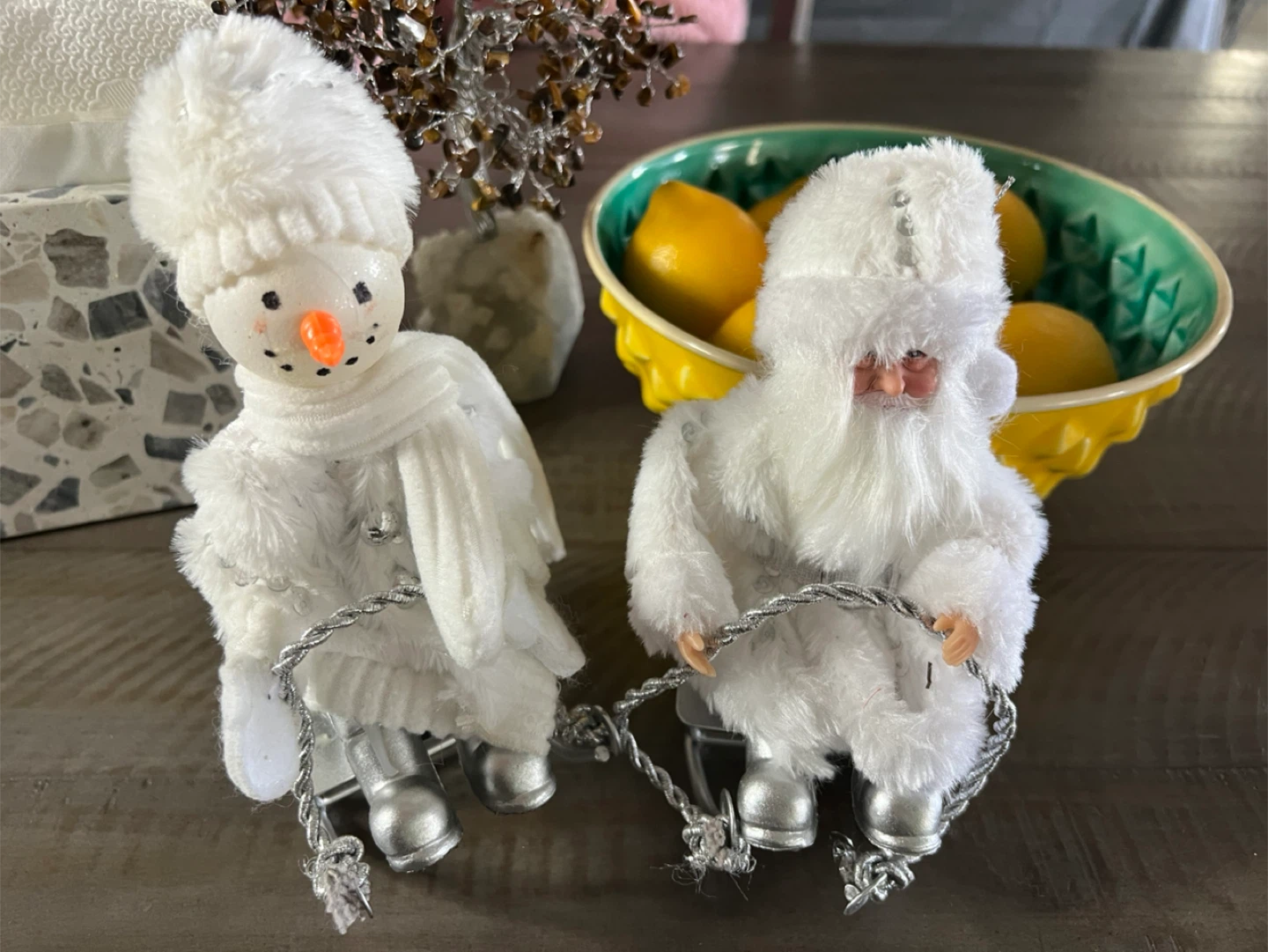 These cute winter figurines are perfect for adding a touch of holiday cheer to your home! They feature a snowman and Santa Claus riding on sleighs, all decked out in fluffy white outfits. They're in great condition and ready to bring some festive spirit to your space