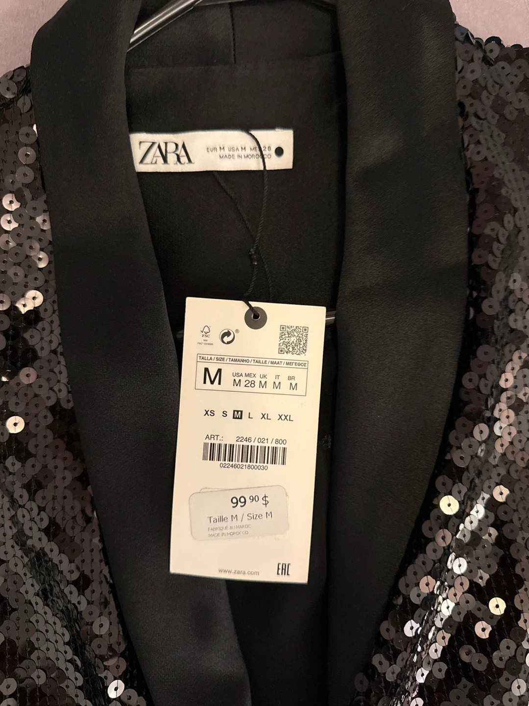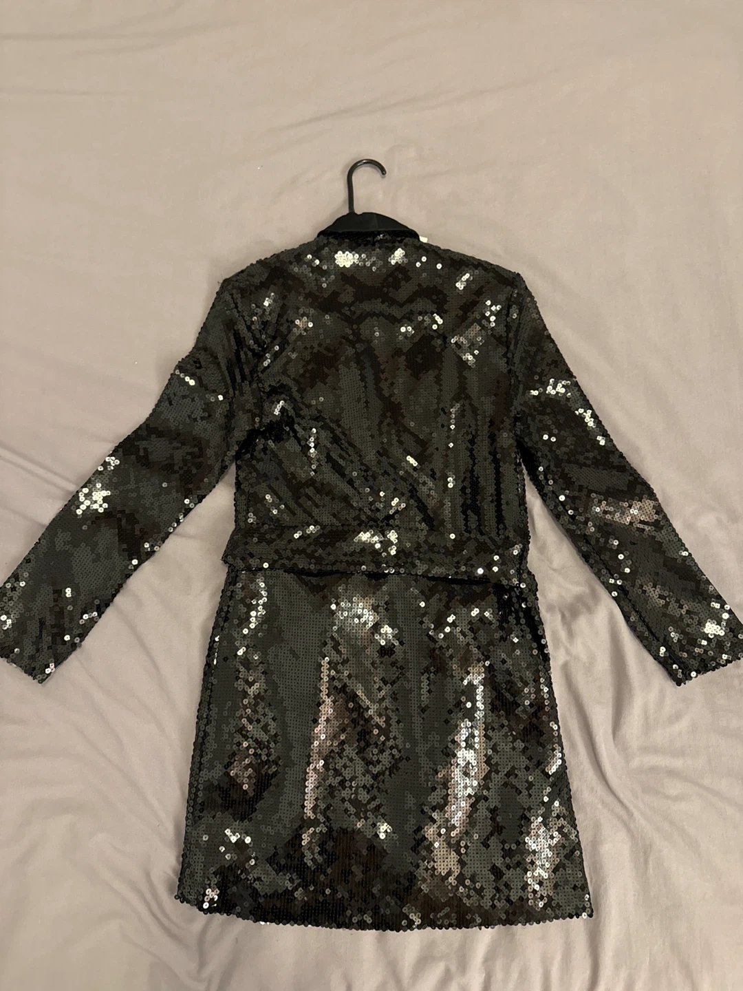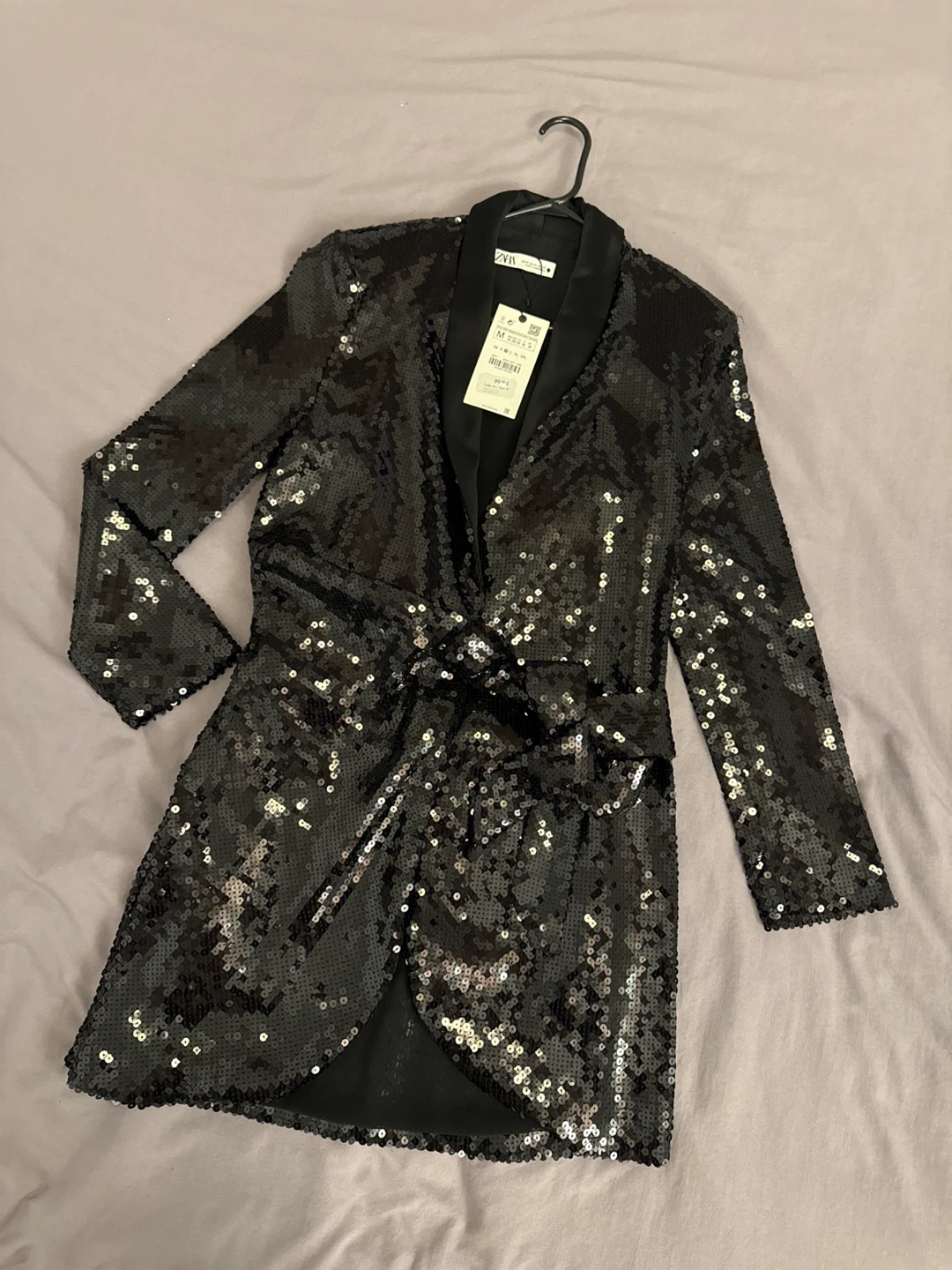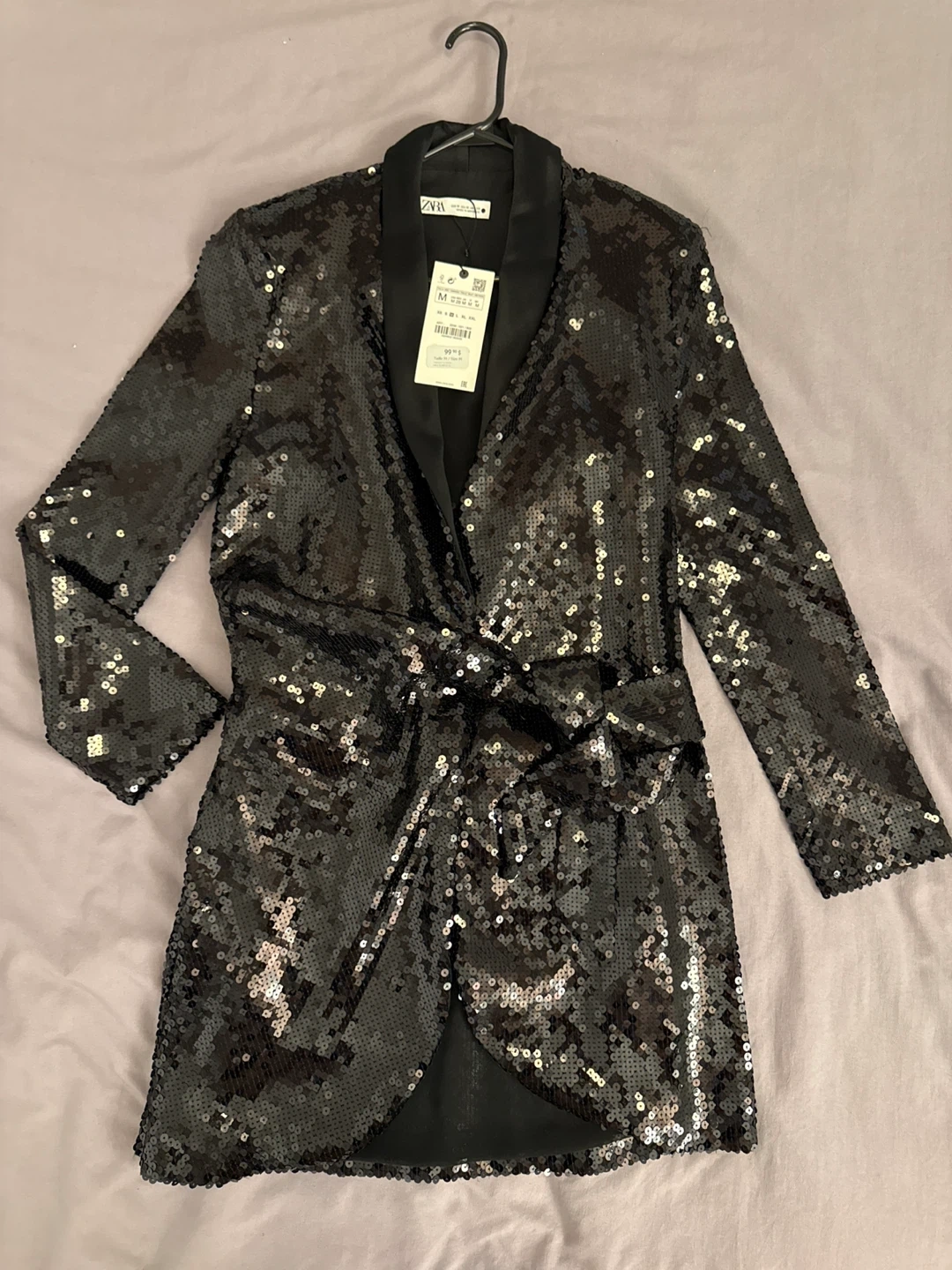 Selling a new Zara sequin dress in size M. It's a stunning piece that's perfect for a night out or a special occasion like Christmas. The dress is in great condition and features a flattering wrap style with a tie at the waist. Originally bought for $99.90 + tax selling for 60$
